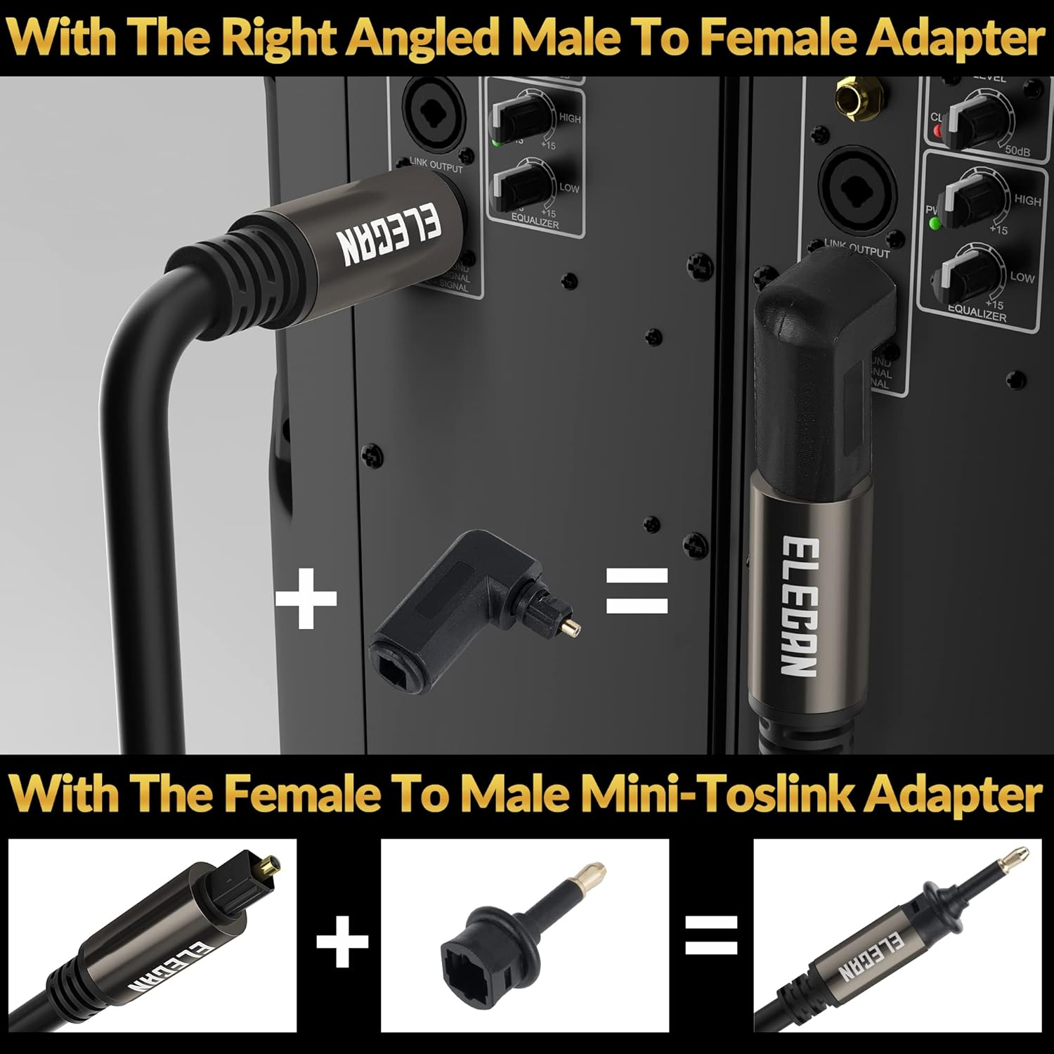 Elecan Optical Audio Cable 150 Ft Digital Audio Toslink Cable Cord-Fiber Optic-Gold Plated-Flexiable&Durable-for Home Theater,Sound Bar,PS4&Xbox-with 4 Right Angled and Mini Toslink Adapters+Ties