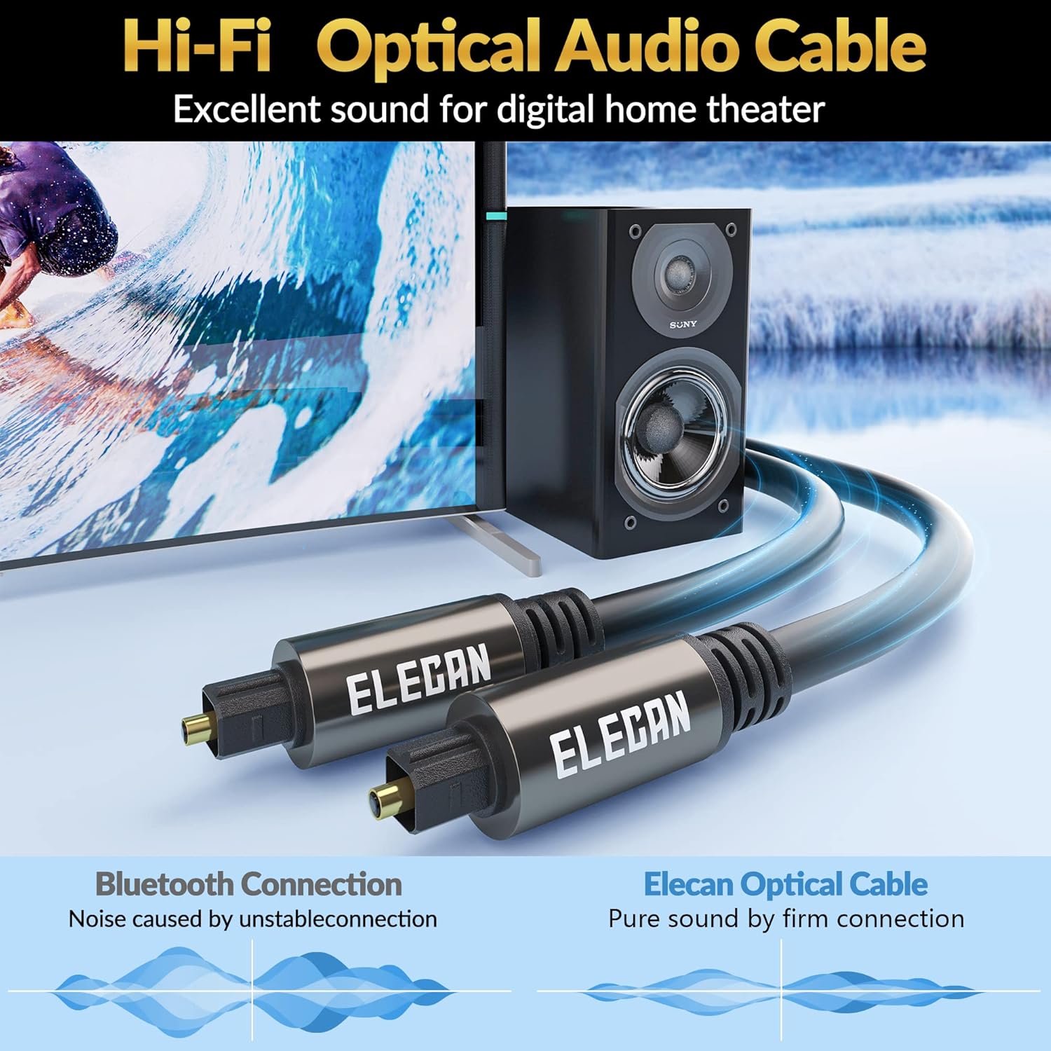 - 【Excellent Sound Quality】: Elecan digital optical audio cable adopts Japan Toray Original Fiber Core for zero distortion Lossless Audio. This Toslink cable is compatible with uncompressed PCM audio and compressed 5.1 to 7.1 surround sound systems including Dolby Digital Plus, DTS-HD High Resolution and LPCM. Perfect and crystal-clear digital audio for DVDs, Blu-rays, home theater systems, receivers, satellite TV, online streaming, PlayStation 4 & Xbox One gaming systems