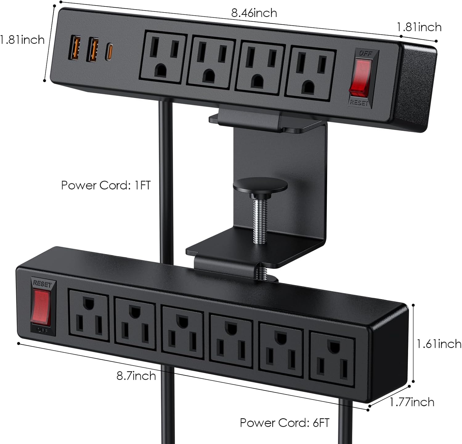 - 【Desk Clamp Surge Protection】 - Constructed from fire-resistant ABS plastic, this power strip offers a 700-Joule surge protection rating with a built-in circuit breaker to guard against overloads, short circuits, and overheating. Effectively handles voltage spikes to keep your computer and other accessories safe.