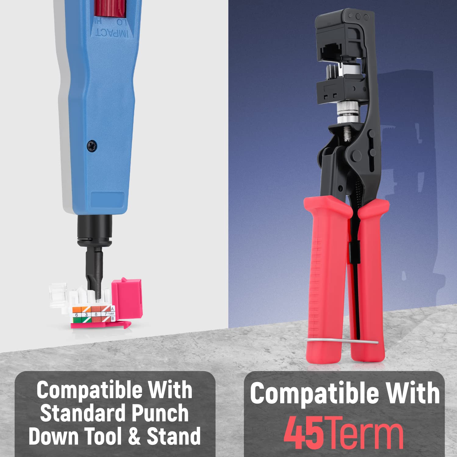 - Compatibility - compatible with our 45° Angled speed termination tool - 45Term (B0BL3GS7ZY). The jacks can also work in conjunction with a standard punch down tool and punch down stand for convenience.