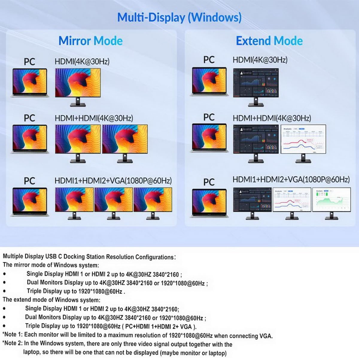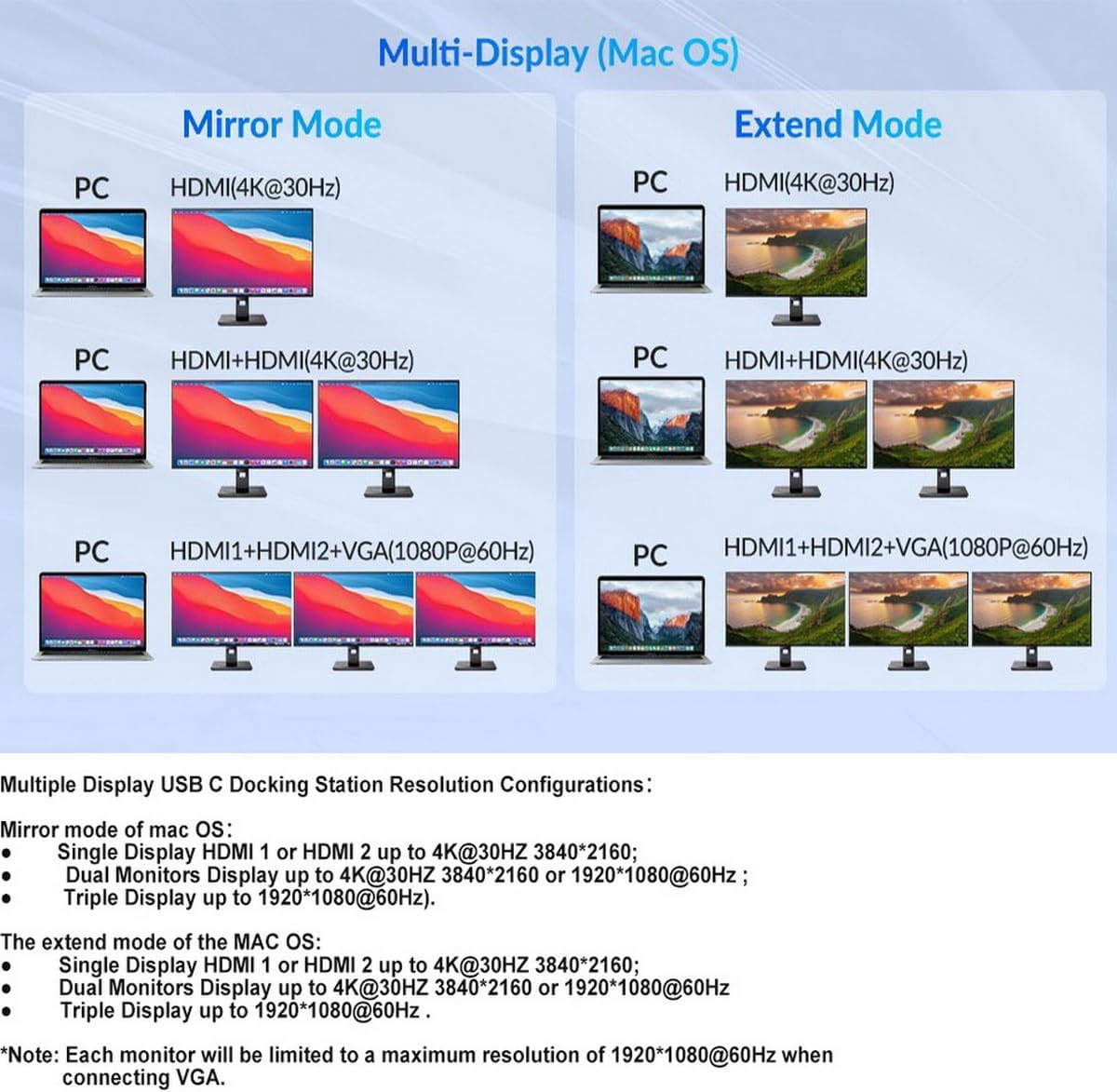 - 【Ultra HD 4K Output & Triple Display】 This USB C Dual HDMI Adapters allows you to extend 3 monitors which provide more space for work, and you can do different project on different monitors, Support Extend Or Mirror Mode, HDMI Resolution up to 3840*2160@30hz, VGA resolution up to 1080P@60hz, downward compatible with 1080I, 720P ; An ideal Gadget for Video Editor, Photography, Programmer. Support both SST and MST mode. 【 Note】Triple display is NOT supported for Apple Mac OS system.