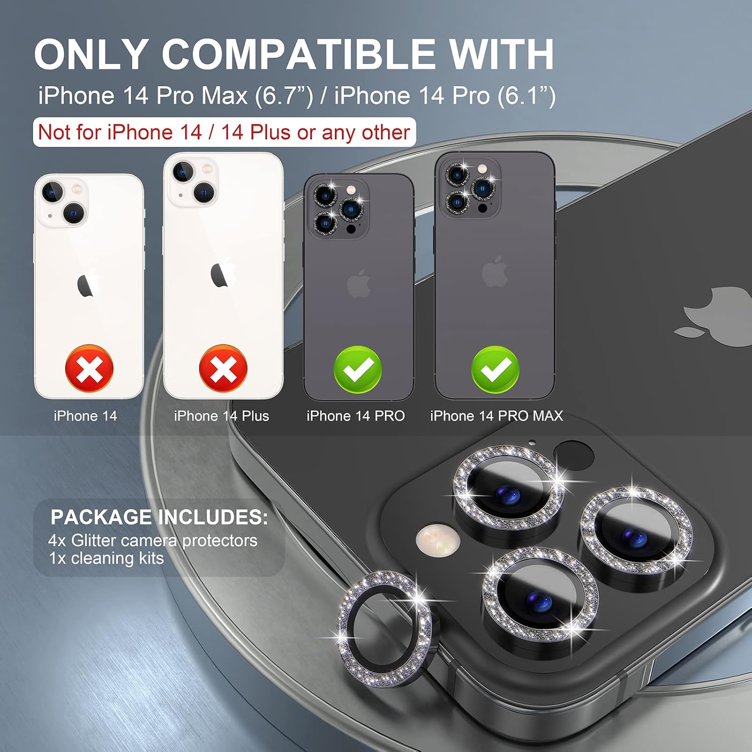 - Bling Camera Lens Protector: We present new upgrade smartphone rear camera lens Protectors which perfectly fit for iPhone 14 Pro Max 6.7-inch & iPhone 14 Pro 6.1-inch 2022 released. The package contains a set of delicate camera lens protectors, an extra spare lens ring, and a set of cleaning kits. Please confirm the iPhone models carefully before purchase.