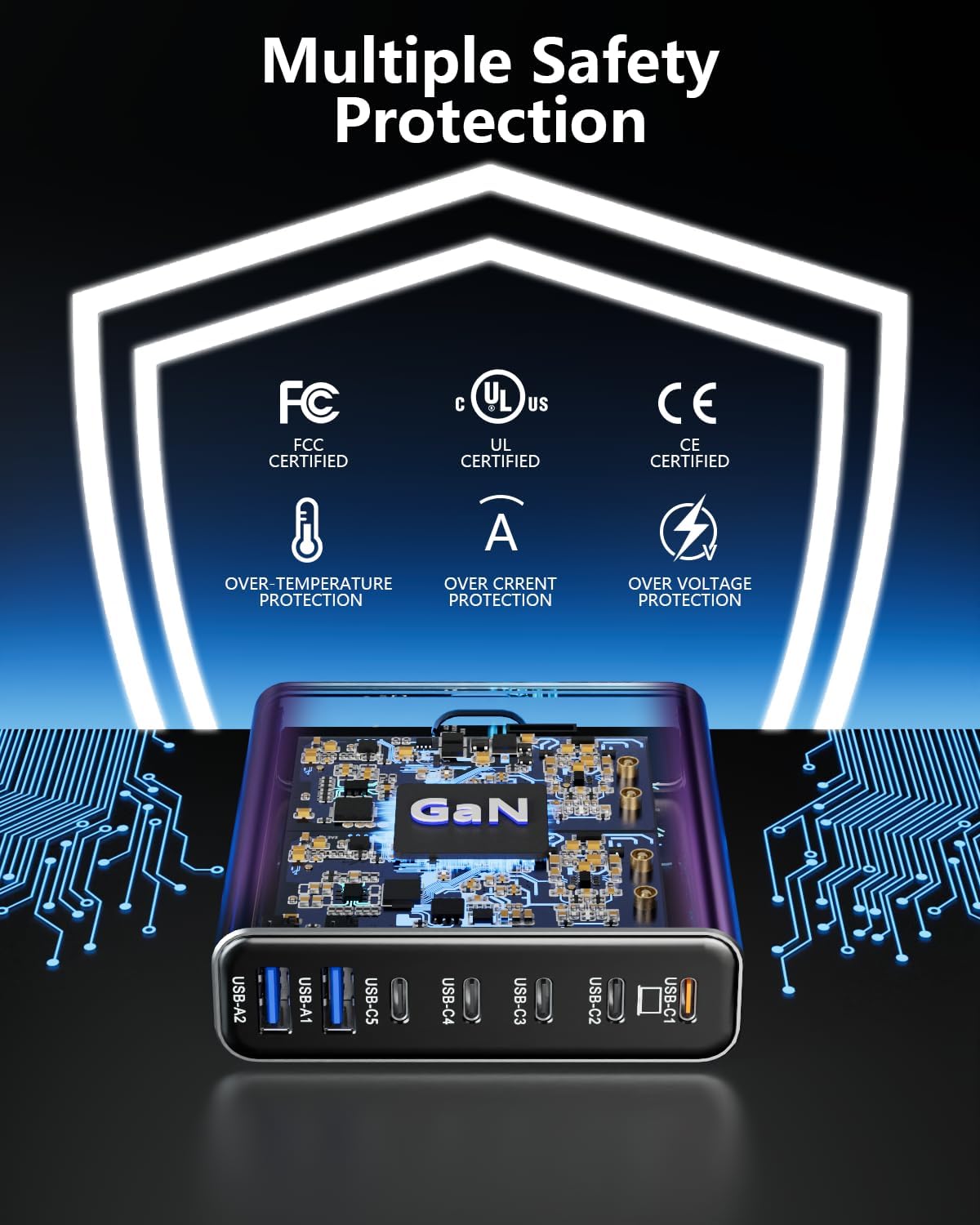 - 7-in-1 USB C Charger: This usb c charger block provides 7 charging wattage options with 5 USB-C ports and 2 USB-A ports. Such a usb c multiport charger can handle all your devices at fast speed with a total output up to 260W. What's cool is that you can charge two laptops with our top two usb c ports of 65w.
