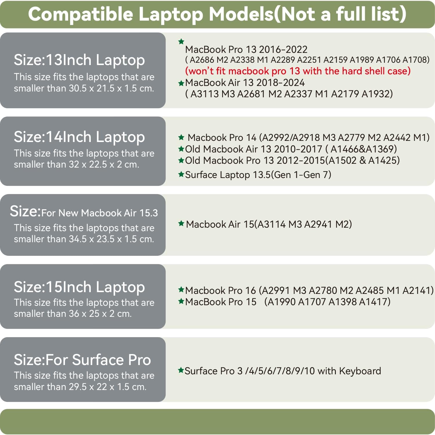 - Perfect Size: Our laptop sleeve is compatible with New Macbook Pro 16 A2991 M3 A2780, Old Macbook Pro 16 A2485 /A2141, New MacBook Pro 15 2016-2019(A1990 A1707), 2012-2015 MacBook Pro 15-inch (A1398 A1417 Model ).Other laptops that are smaller than these dimensions-36x25x2 cm.If your laptops are too small than the above dimensions,then the sleeve will be a loose fit.If one of your laptop's width,depth or height is larger ,then this size could not hold it