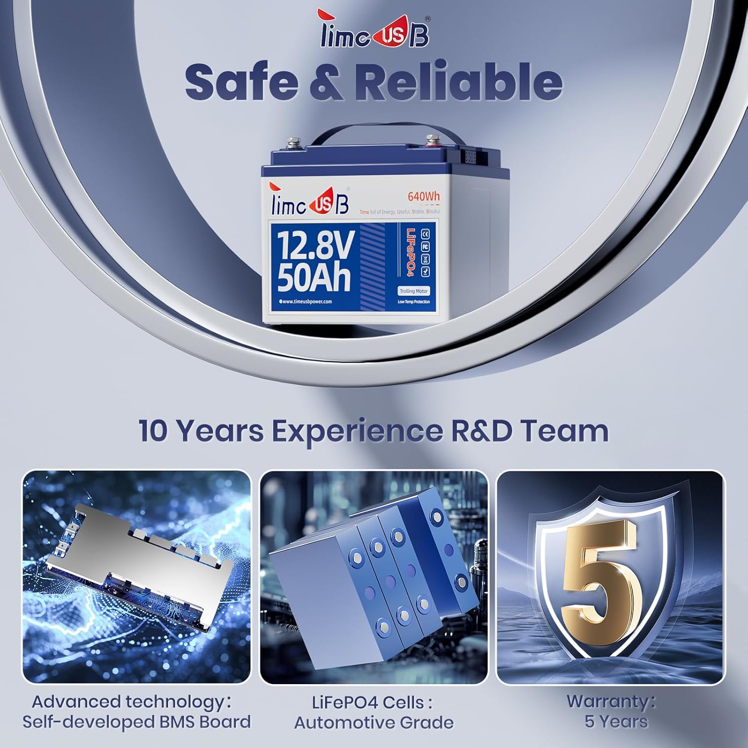 - ✅10 Years Long Lifetime: The Timeusb lithium iron phosphate battery (LiFePO4) offers an extended cycle life, with the ability to be recharged between 4000 and 15000 times in a deep cycle. This exceptional longevity surpasses traditional lead-acid batteries that typically offer only 300-500 charge cycles