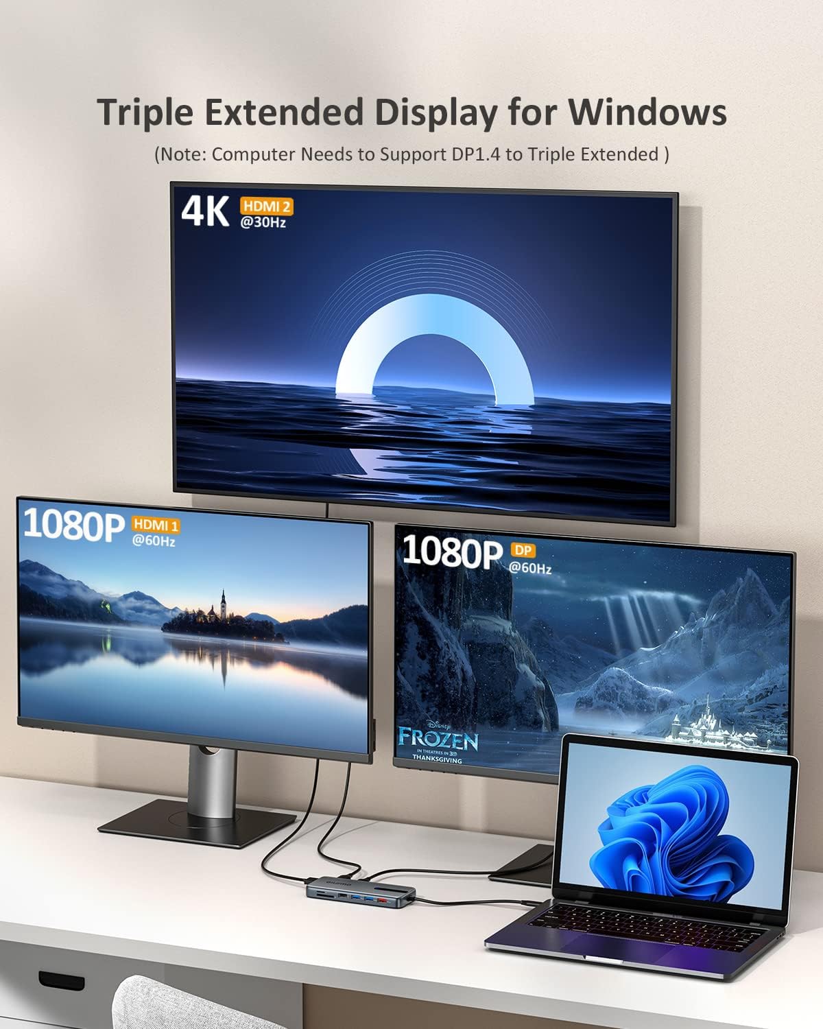 - 【4K Dual Monitor&Triple Display for Windows】The Laptop docking station can easily to achieve dual-monitor and triple-monitor displays for Windows OS. Single screen can achieve up to 4K@60Hz(DP 1.4), Windows users can achieve BC/BCD effect when dual monitor or triple display, up to 4K@30Hz. (Note:Display effect will vary due to computer parameters).♥♥Please note that: Mac OS ONLY support mirror mode, up to 4K@60Hz♥♥