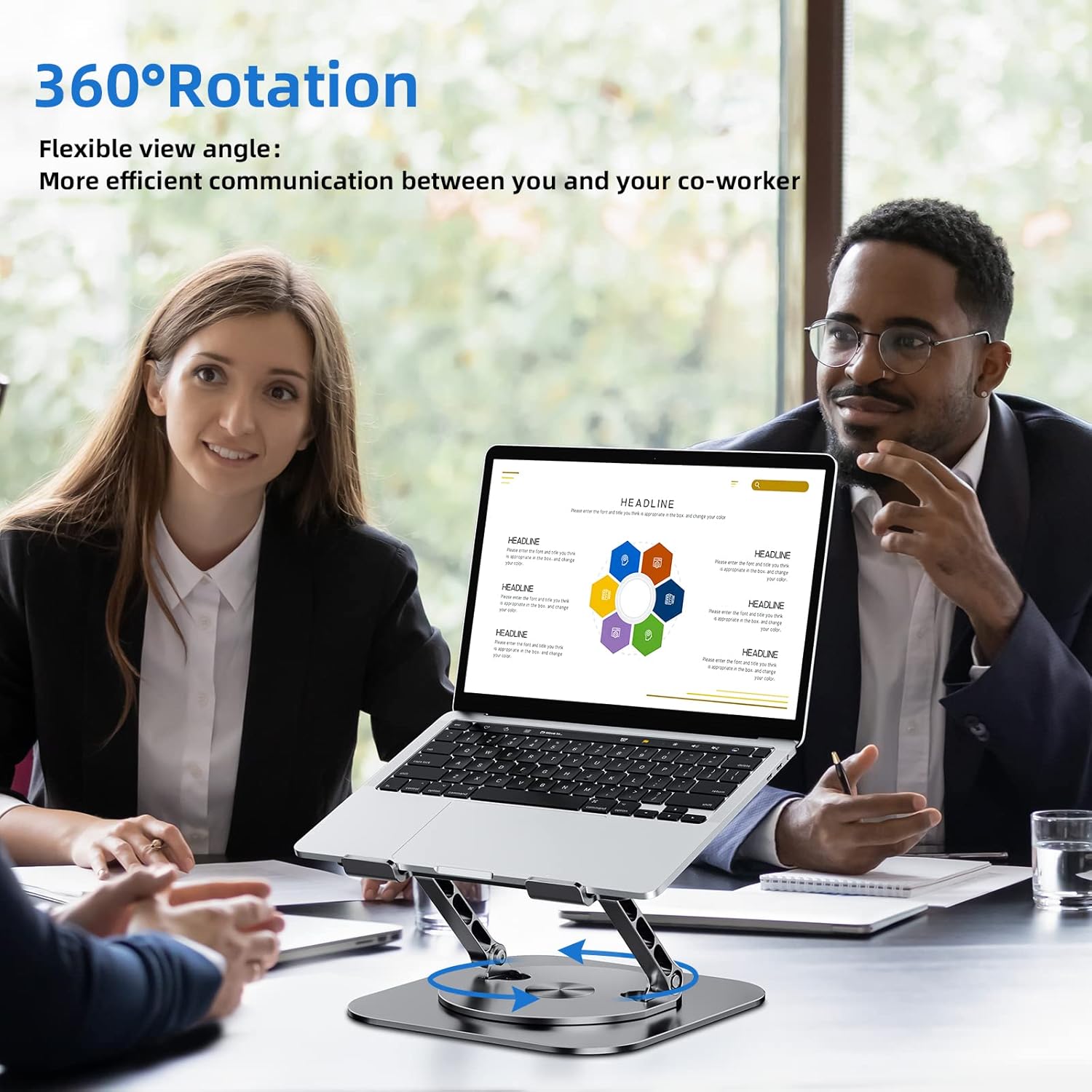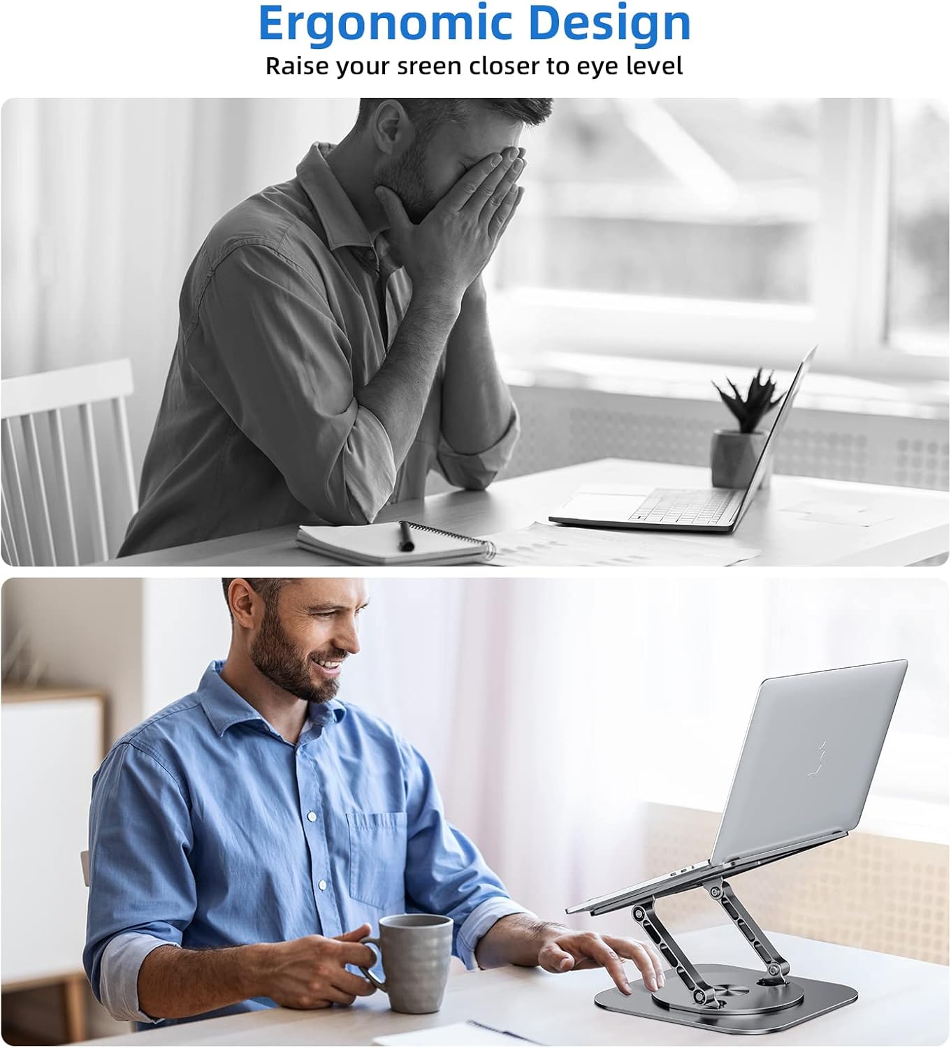 - 360°Rotation:Laptop stand for desk 360° rotatable, Two-axis connecting with the base, makes the rotation more flexible, allows you to swivel your laptop to any angle. It is very suitable for sharing content in meetings or communication
