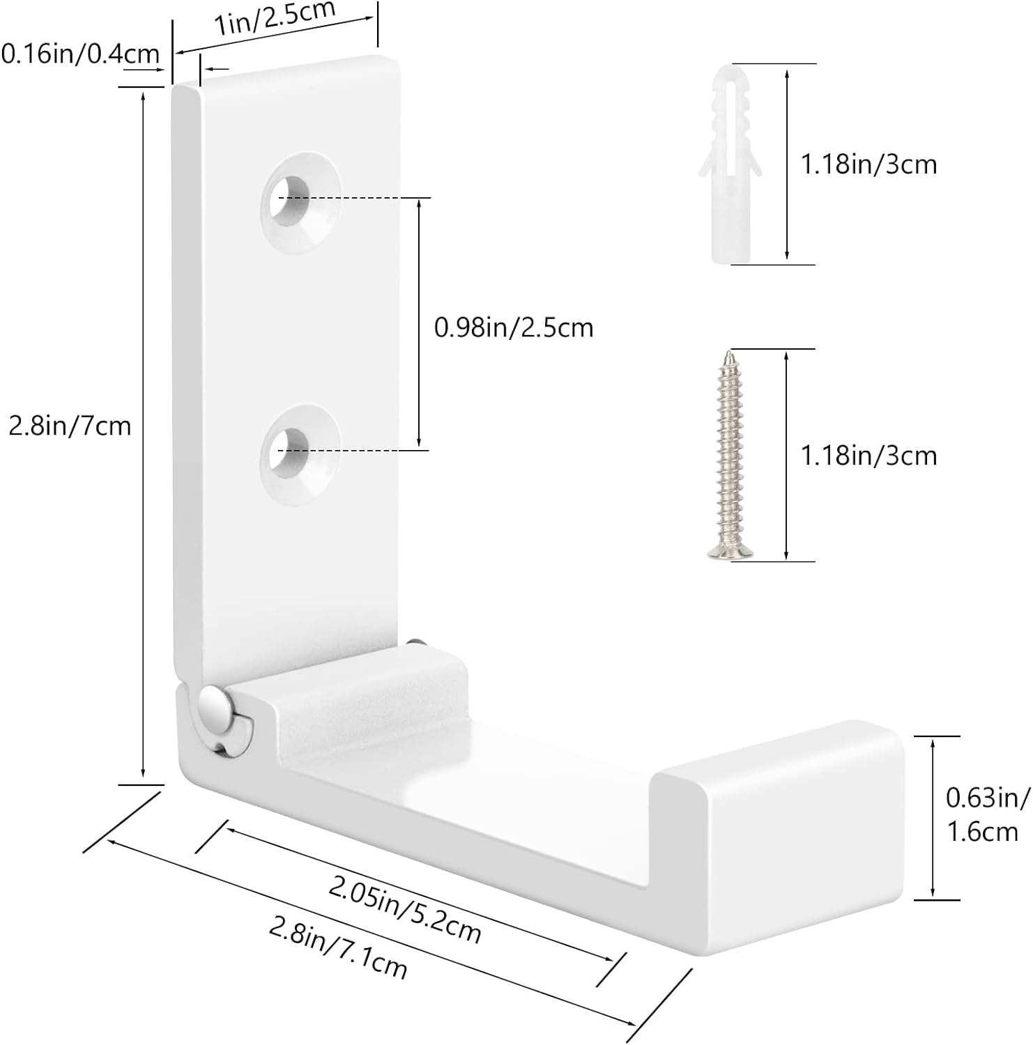 - Package & Size: Includes 5 wall hooks, 10 screws, 10 anchors, 2 adhesive glues, 5 sponge pads, 5 auxiliary stickers. Hook dimension: 2.8 x 2.8 x 0.63 inches, screws are 1.18 inches. Contact us through amazon if you have any issues with our product at any time, we will provide you a free replacement or refund your money without any issues in 24 hours.