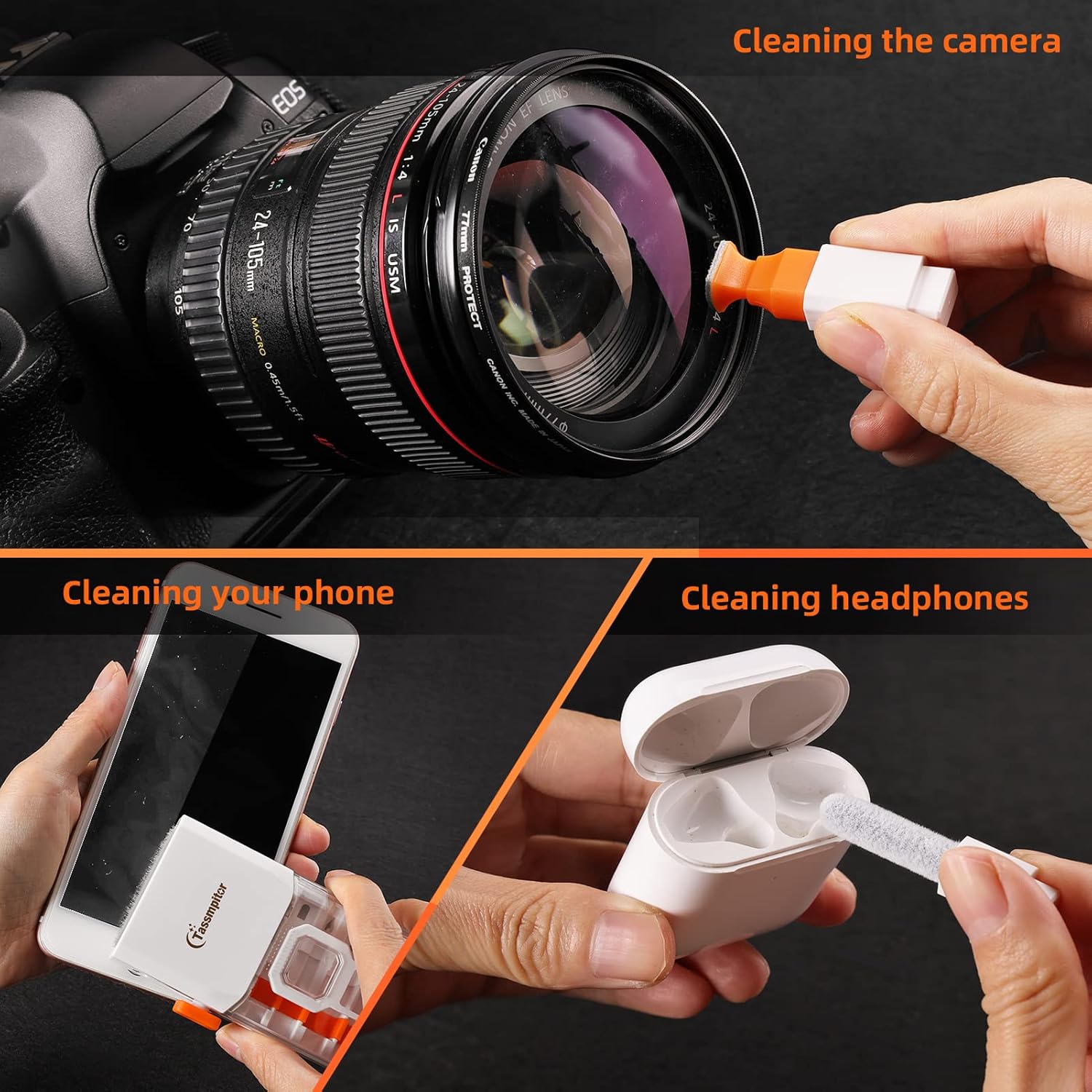 - MULTIFUNCTION IN ONE GADGET - Mini soft brush and Soft plastic lens cleaning pen is especially designed for DSLR camera screen, lens and other delicate surfaces. 5 more cleaning cloth of it supplied for replacing. The flocking sponge is an excellent tool for cleaning headphones charging cases, while the metal pin tip and high-density brush are ideal for cleaning the sound outlet holes on earbuds. Keep your smartphone, camera lens, laptop, headphones and other electronic accessories clean.