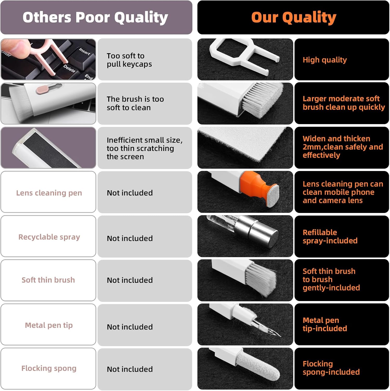 - DEEP CLEAN YOUR DEVICE - The keyboard cleaner can effectively deep clean all your electronic devices such as keyboards, laptops, macbooks, computers, smartphones, iPhone, iPad, tablets, car seat crevices, etc. It comes with retractable large keyboard brush, polishing cleaning cloth X 2, keycap puller, metal pen tip, flocking sponge, thin soft brush, soft plastic lens cleaning pen, 5 replacing cloth , large cleaning microfiber cloth. It's compact so you can keep one in a drawer, one in the car or in your bag.