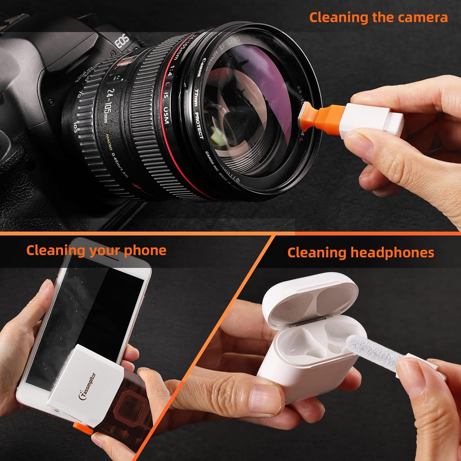 - MULTIFUNCTION IN ONE GADGET Mini soft brush and Soft plastic lens cleaning pen is especially designed for DSLR camera screen, lens and other delicate surfaces. 5 more cleaning cloth of it supplied for replacing. The flocking sponge is an excellent tool for cleaning headphones charging cases, while the metal pin tip and high-density brush are ideal for cleaning the sound outlet holes on earbuds. Keep your smartphone, camera lens, laptop, headphones and other electronic accessories clean
