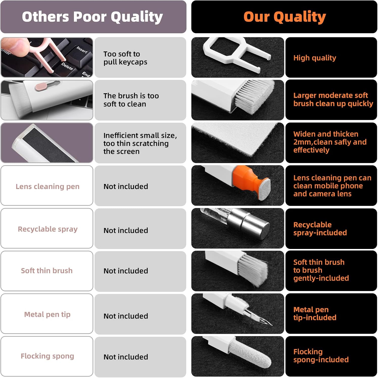 - DEEP CLEAN YOUR DEVICE The electronics cleaner kit can effectively deep clean all your electronic devices such as mobile phones, tablets, TVs, etc. It comes with retractable large brush, polishing cleaning cloth X 2, keycap puller, metal pen tip, flocking sponge, thin soft brush, soft plastic lens cleaning pen, 5 replacing cloth , large cleaning microfiber cloth. It's compact so you can keep one in a drawer, one in the car or in your bag