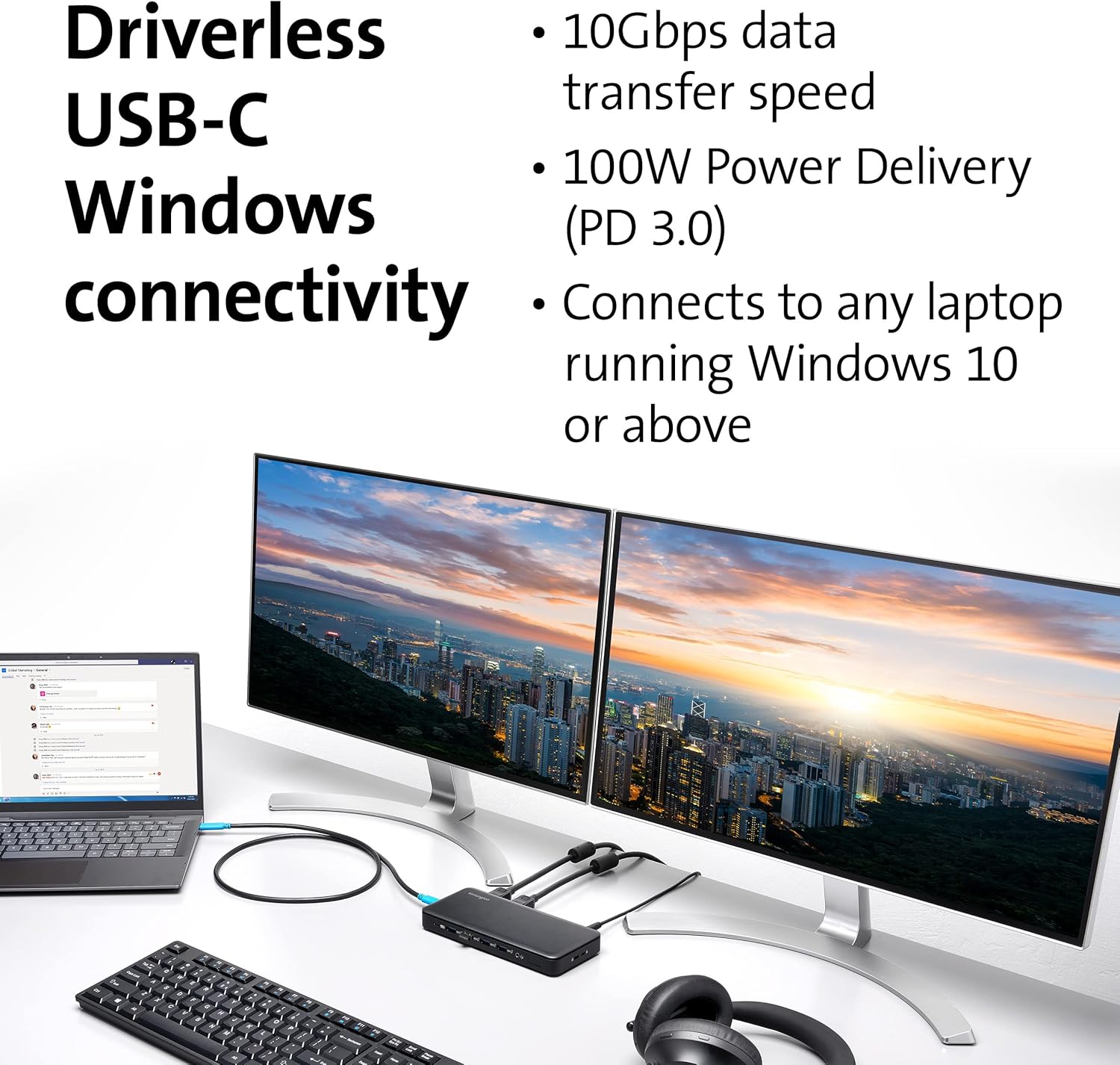 - 1M USB-C cable (included) connects the dock to your device; 135W power supply provides up to 100W laptop charging to laptops that accept Power Delivery plus power for peripherals