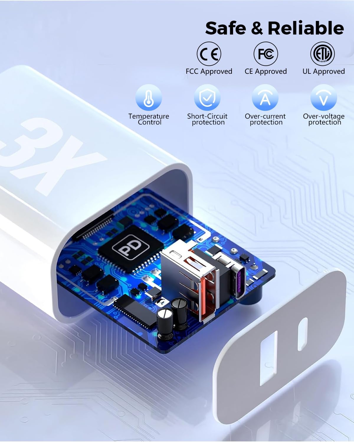 - 🎀【SAFE & RELIABLE】Dual Port USB C+A Charger Block Built-in Safeguards Protect Your Devices Against Excessive Current, Overheating, and Overcharging, the Charger Block will Automatically Stop Charging When Power is Full to Protect Your Device.