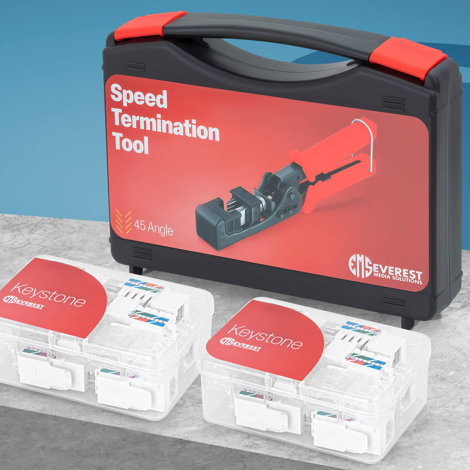 Everest easyJACK - 45° Angled Speed Termination Keystone Tool Set - with 20-Pack of RJ45 Cat6 Keystone Jacks in White (Slim Profile Design) - Time Saver Network Punch Down Tool Cat6