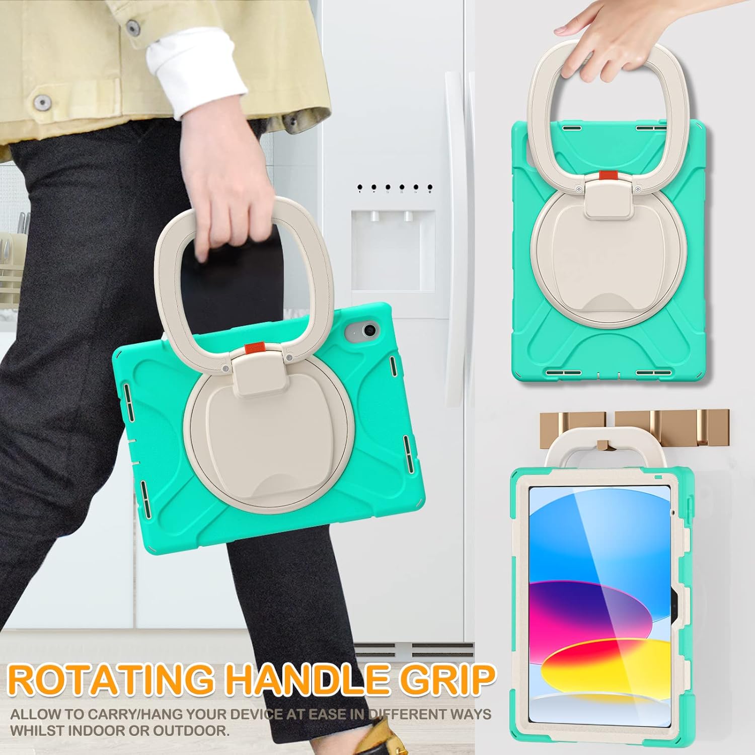 - Multi-Function Handle / Kickstand: 360°rotating / 180°folding grip, can be used as a handle, easy to hang your iPad in kitchen, washroom, bedroom; Kickstand is stable enough to stand on different surfaces for children to view. Button and port cover enable to proof dust