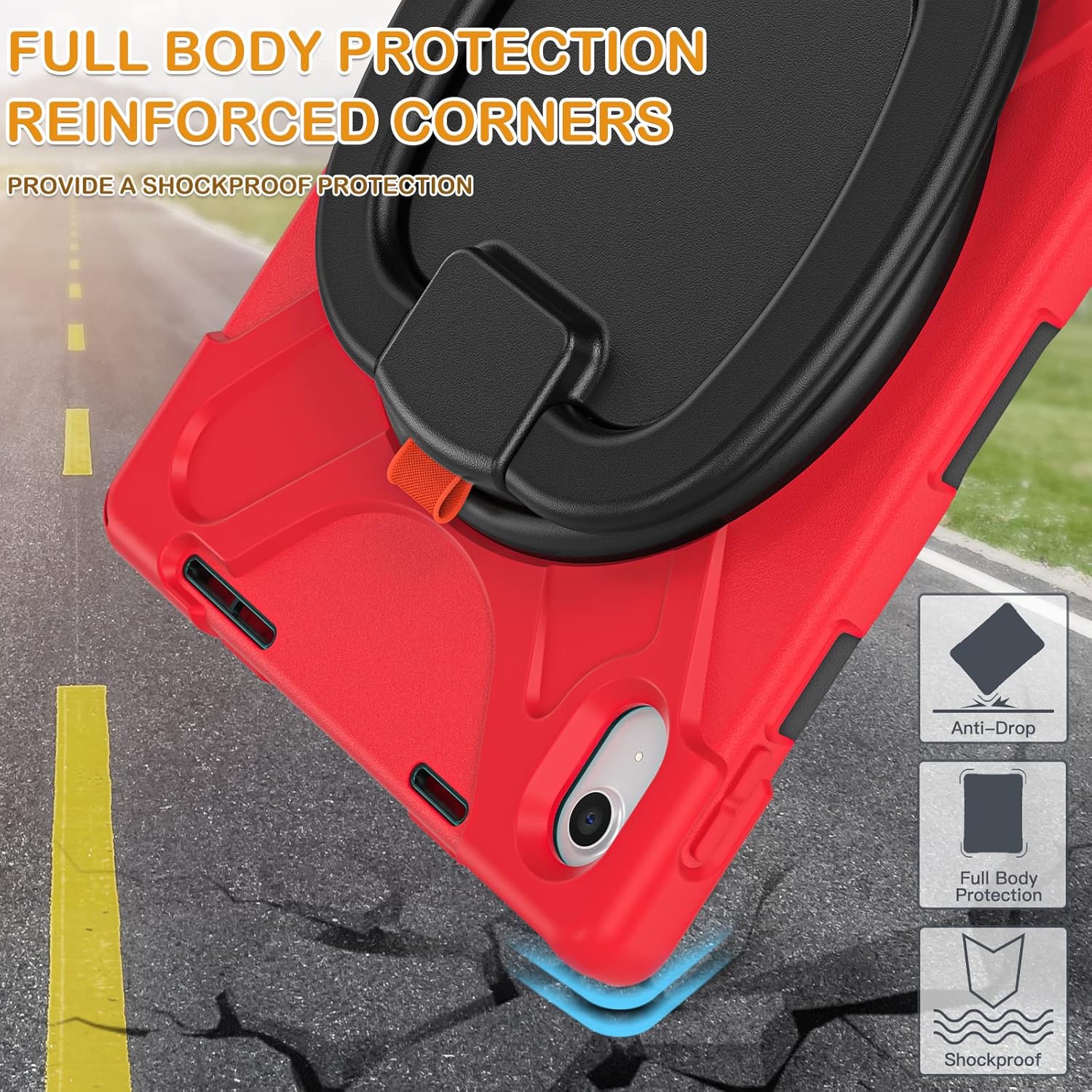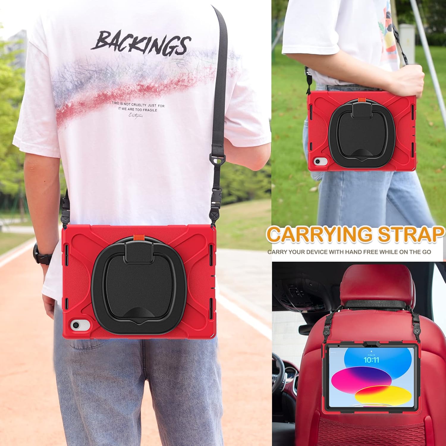 BRAECN Kids Case for iPad (A16) 11th/10th Generation 11”/10.9'' 2025/2022, Heavy Duty Rugged Silicone Cover w/Swivel Ring Stand/Stable Kickstand/Shoulder Strap/Pencil Holder/Screen Protector, Red