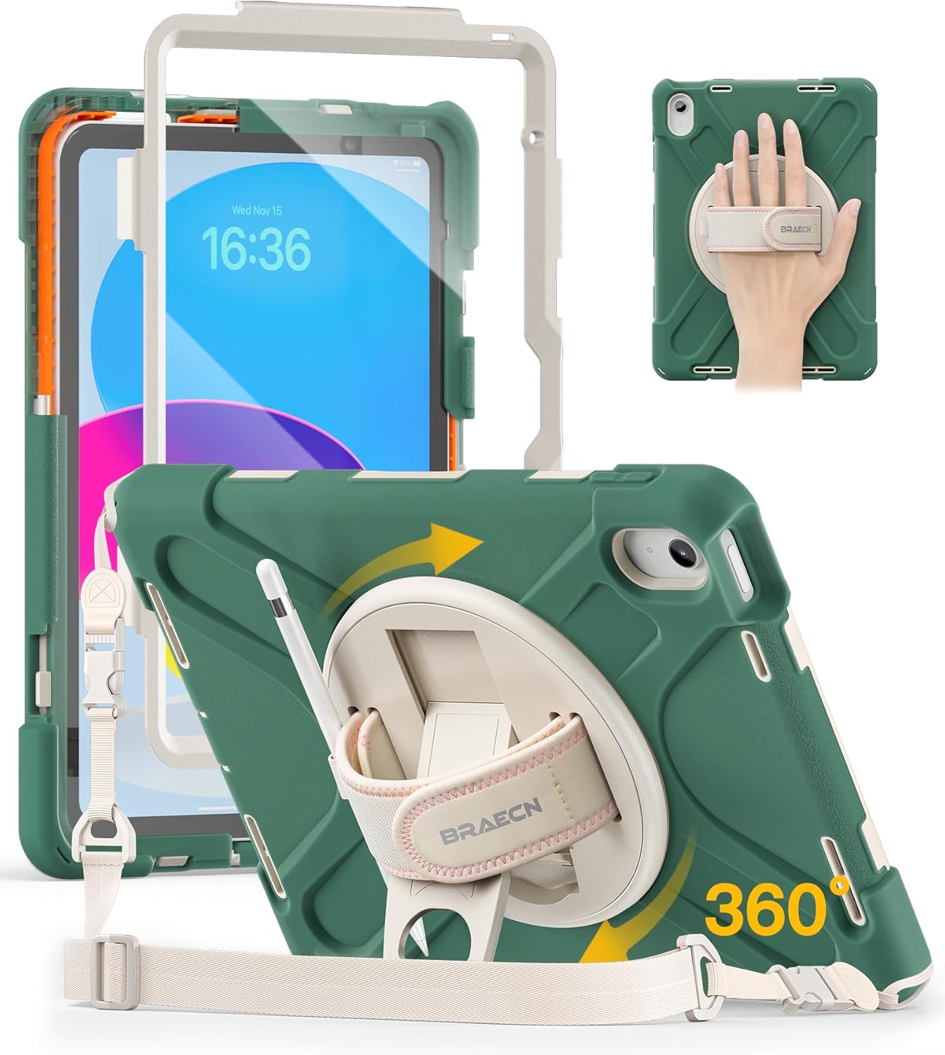 BRAECN for iPad (A16) 11th/10th Generation case 11/10.9 inch 2025/2022 Heavy Duty Shockproof Protective with Pencil Holder Screen Protector 360°Rotating Stand Handle & Shoulder Strap Full Body Cover