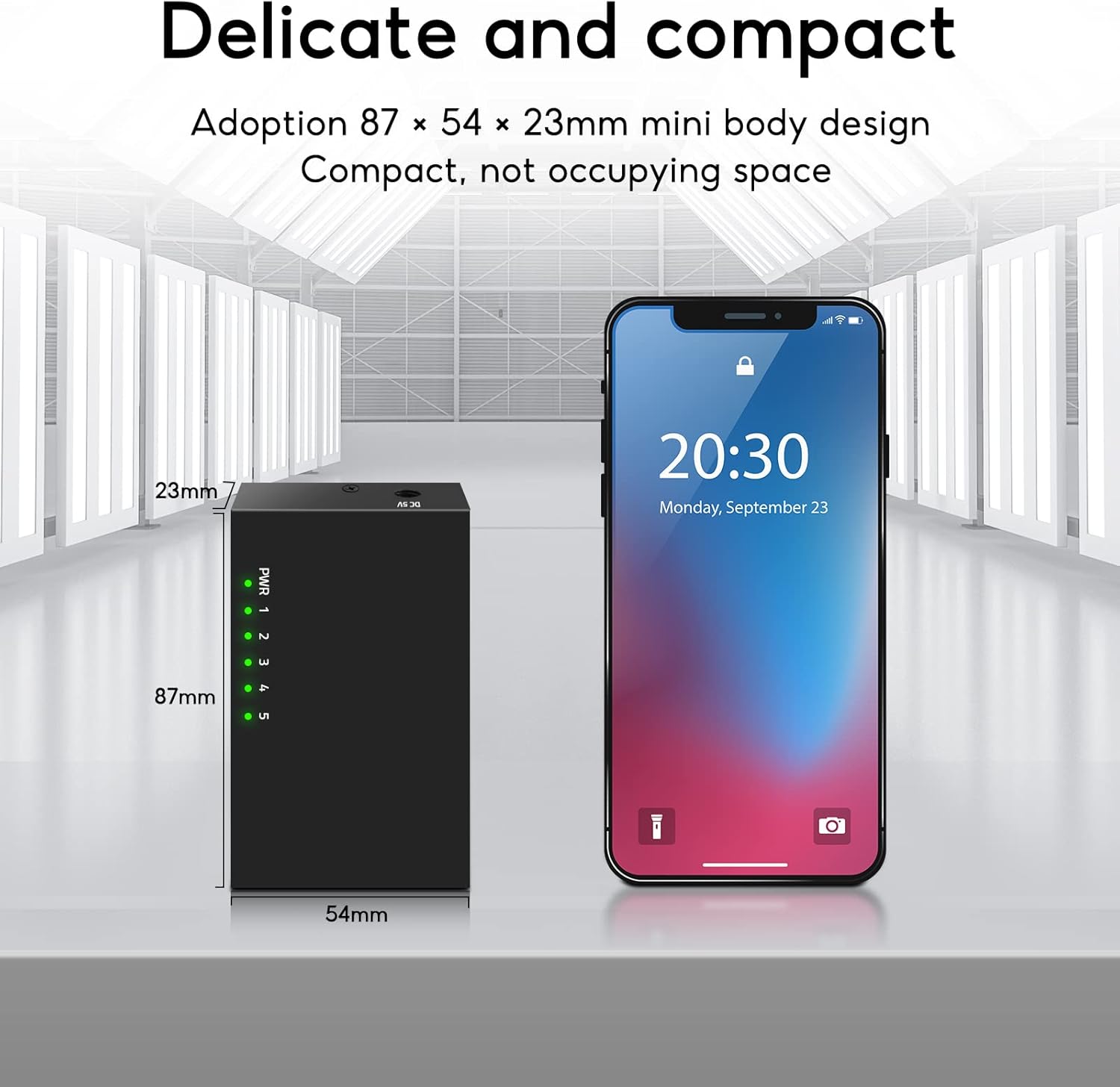 - 【5 Port Gigabit Switch】5×10/100/1000Mbps RJ45 Ports supporting Auto Negotiation and Auto MDI/MDIX. The 5-port Gigabit intelligent Ethernet switch adopts high-quality and high-speed network ICs,greatly expand network capacity.