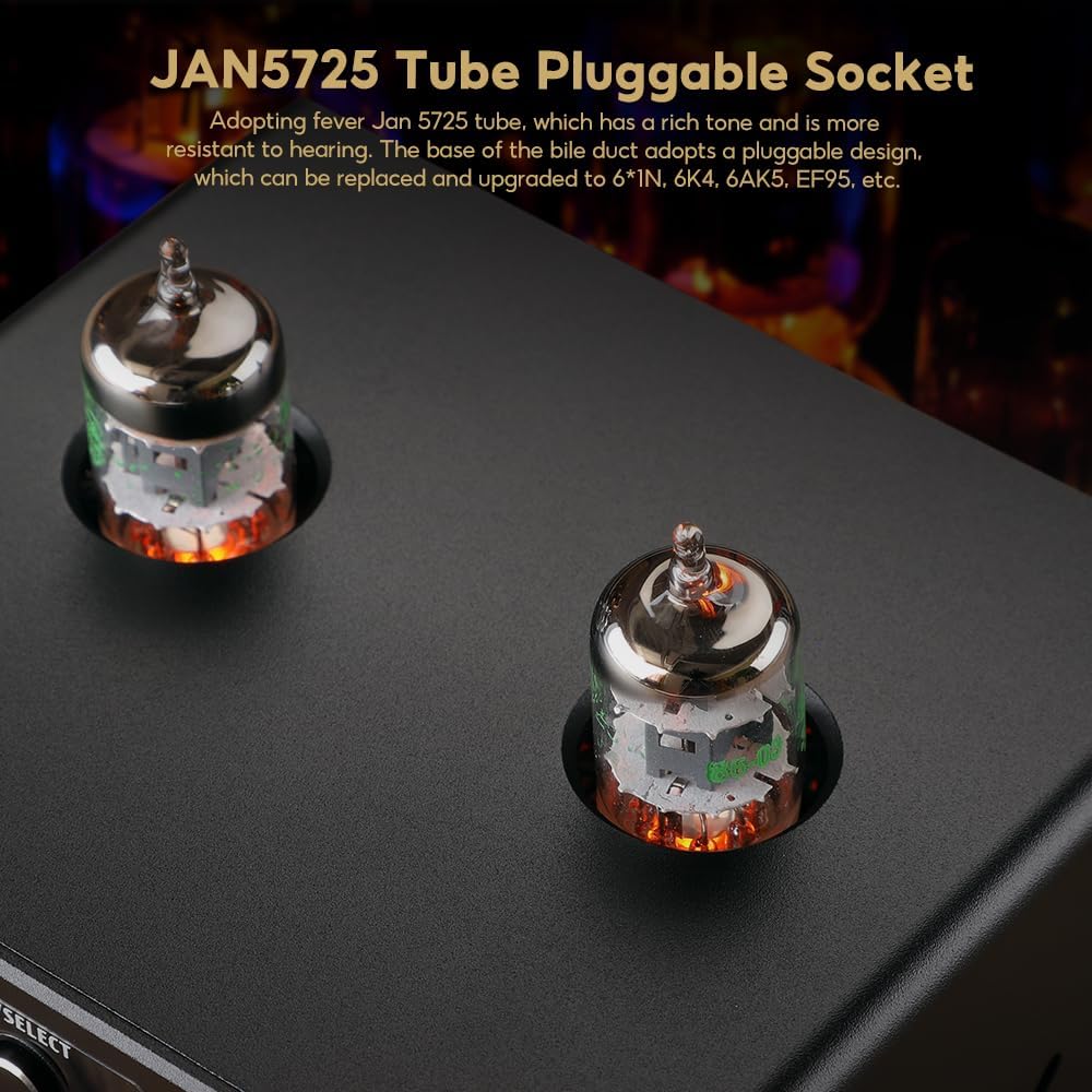 - 【HiFi clear sound with tone control】Resonable circuit and concise wiring, adopts upgraded vacuum tubes Jan 5725 to soften the sound and filter out the digital feelings, sounds warm and sweet without noise. Also with the treble and bass knobs to adjust one's own preferable sound styles, presents HiFi music with rousing highs and deep lows