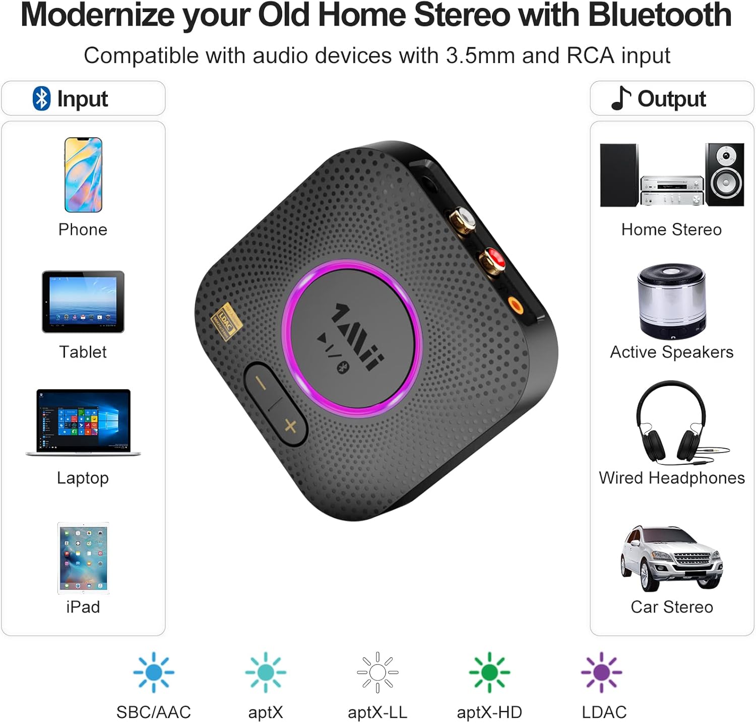 - 【Upgraded New Function】With B06S+, let non-Bluetooth-enabled home stereo/powered speakers/amplifier/av receiver conect to iPhone/Android wirelessly streaming your favorite music. Added LED light circle design, you can know the switching of codec formats timely. Each color corresponds to the decoding format one by one.