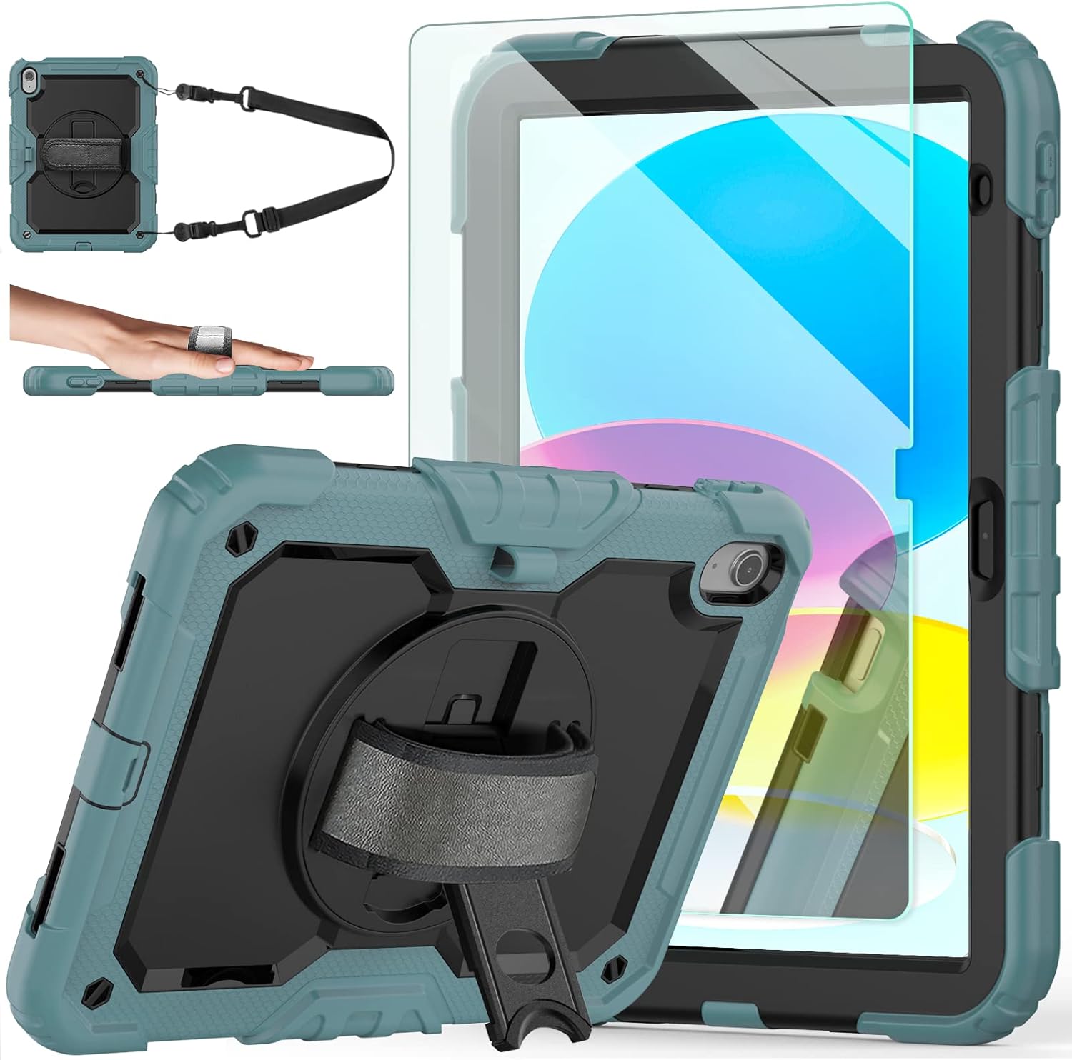 Ambison Case for iPad A16 11th/10th Generation 11"/10.9'' 2025/2022,Heavy Duty Shockproof Case with Tempered Glass Screen Protector, 360° Rotating Handle Strap&Stand,Shoulder Strap-Teal