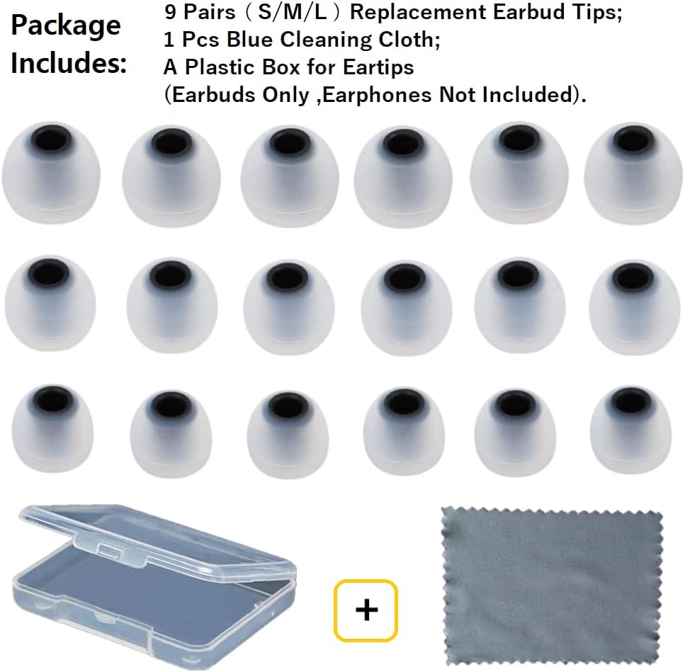 - Package Includes: 9 Pairs(S/M/L)Replacement Earbud Tips;1 Pcs Blue Cleaning Cloth;A Plastic Box for Eartips(Earbuds Only ,Earphones Not Included).