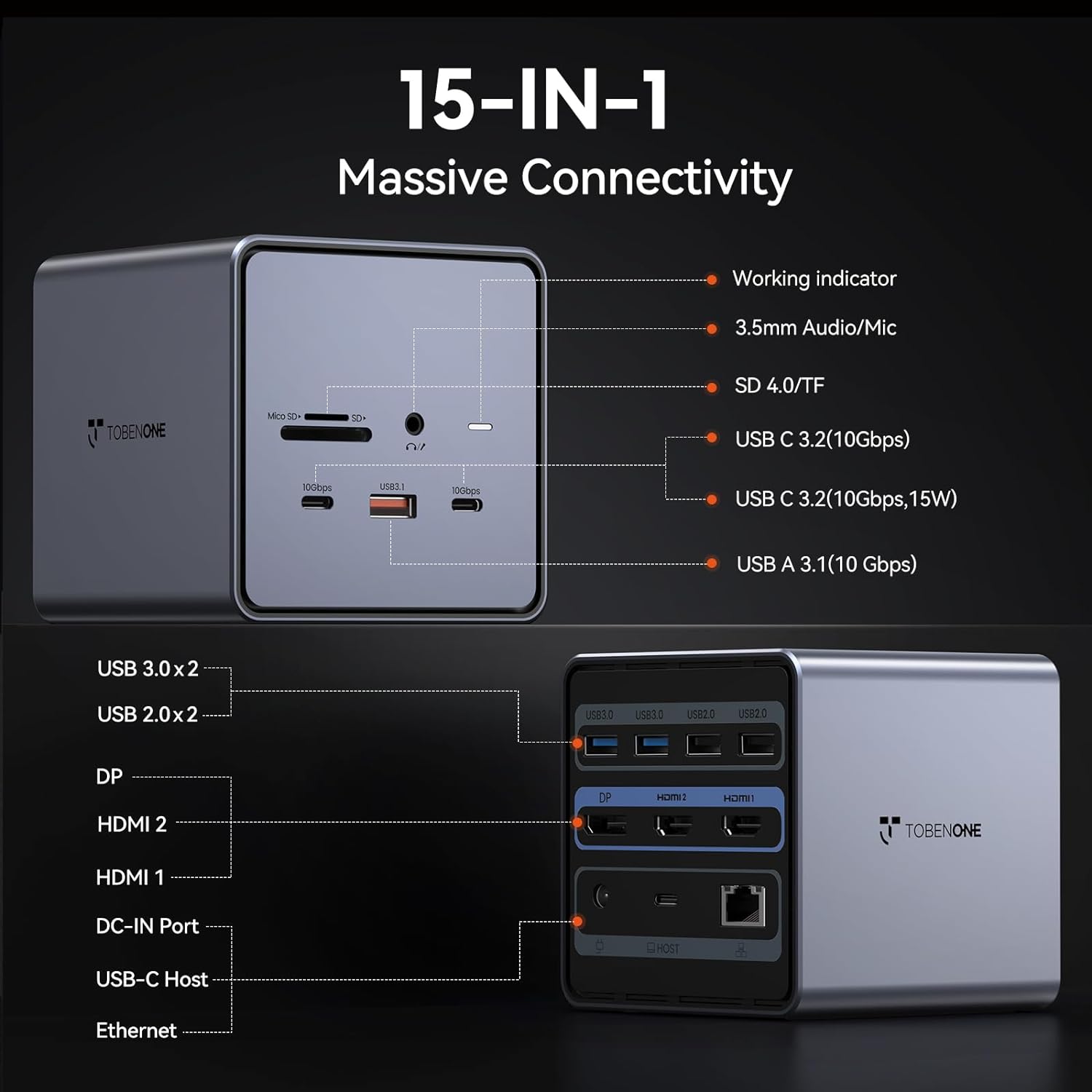 TobenONE USB C Docking Station Dual/Triple Monitors with 150W Power Adapter for Dell/HP/Lenovo/Surface/Asus/Chromebook, 2 HDMI, DP, 5 USB, Ethernet, SD 4.0/Micro SD