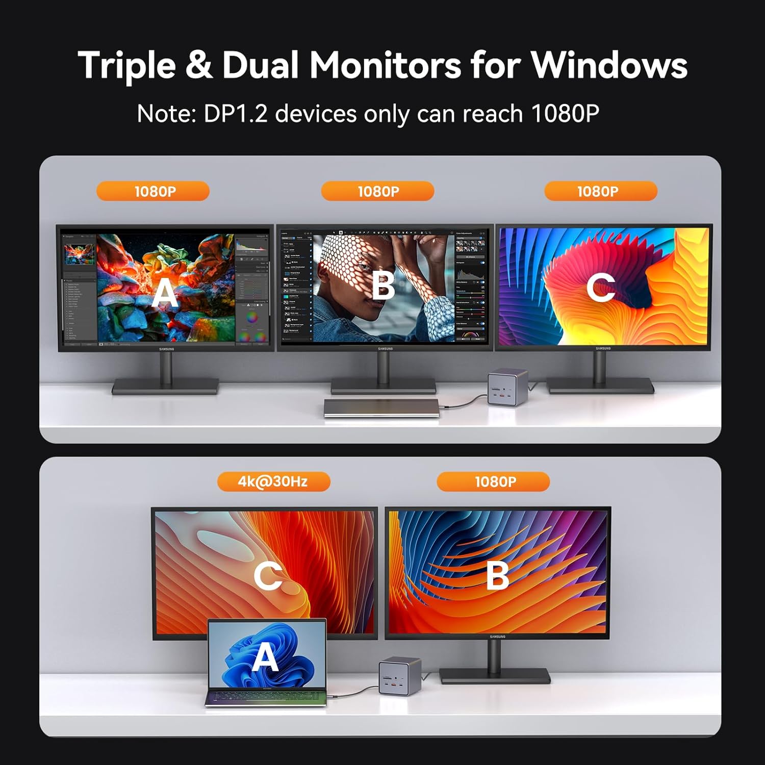 - Extend Dual/Triple Monitor Docking Station: This USB C docking station can extend your USB C Windows laptop to multiple screens. When you extend a single monitor, the resolution can be up to 4K@60Hz (DP1.4 source). Extending 2 monitors, the first detected monitor resolution can be up to 4K/30Hz and the other only 1080P. Extending 3 monitors(the laptop needs to close the lid), the resolution both can be up to 1080P