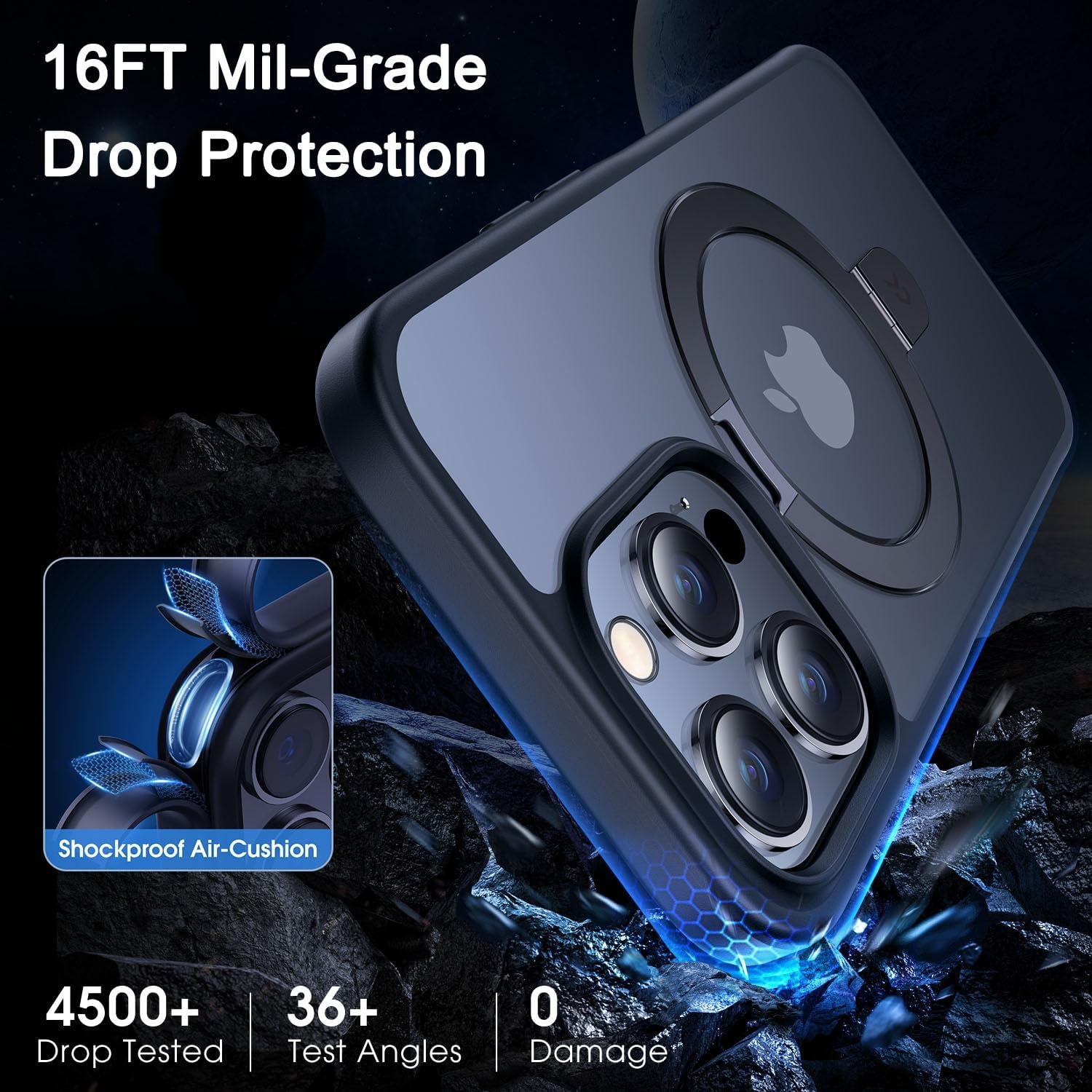 - [16FT Military Grade Protection] Based on 5000+ extreme drop resistance tests, the MagicStand case's durability and sturdiness surpass most ordinary phone cases. It passed the Military Grade test by the (MIL-STD-810H 516.8). The shockproof polycarbonate back and airpad cushioning enhance protection against daily drops and bumps. A 2.5mm raised camera border prevents lens scratches, while a 1.24mm bezel safeguards your screen