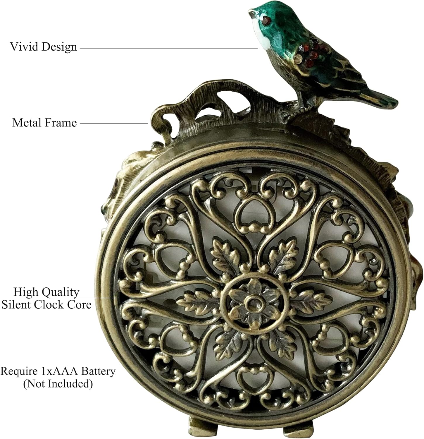 - MATERIAL: This vintage table clock is made from real metal and High quality silent clock core. The vintage table top clock is operated by a single AAA battery (not included).