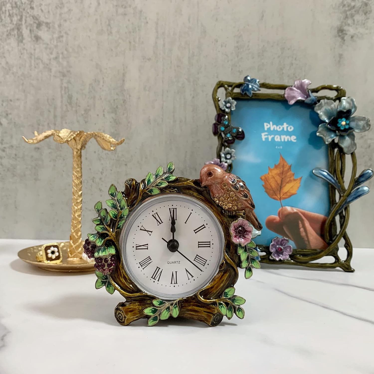 - VINTAGE DESIGN & EXCELLENT CRAFT: Creative design of delicate flower and noble carvings gives these decorative mini table clock an elegant vintage appearance. Each piece of the clock frame is individually Hand-painted, will definitely add vintage and charm to your kitchen, living room, bathroom, or bedroom.