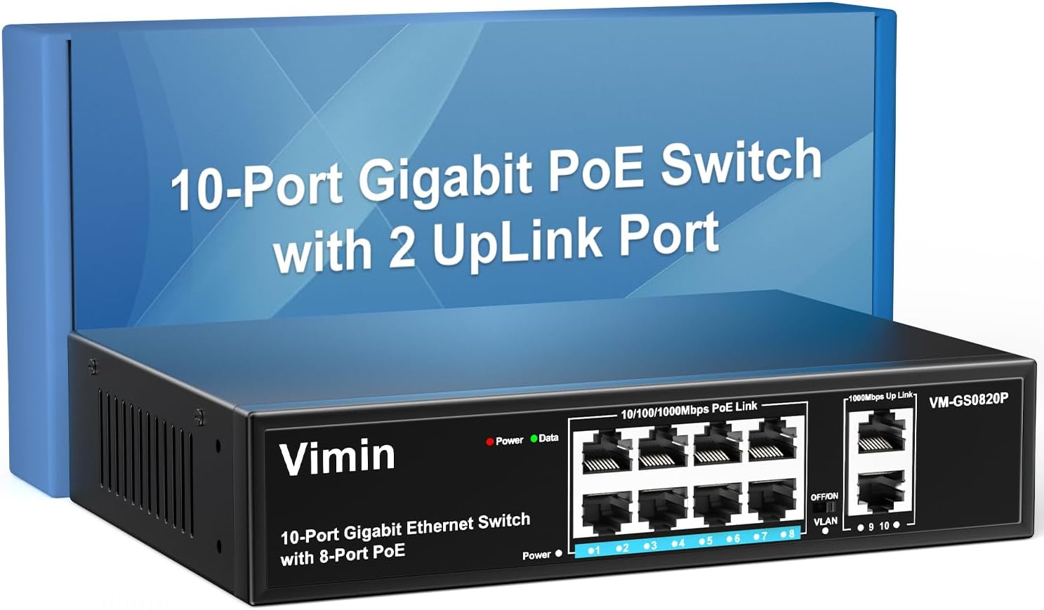 8 Port Gigabit PoE Switch with 2 Uplink Gigabit Ports, VIMIN 10 Port Unmanaged Ethernet PoE Switch with 120W Power, Support IEEE802.3af/at, VLAN, Metal Housing, Desktop or Wall-Mount, Plug & Play
