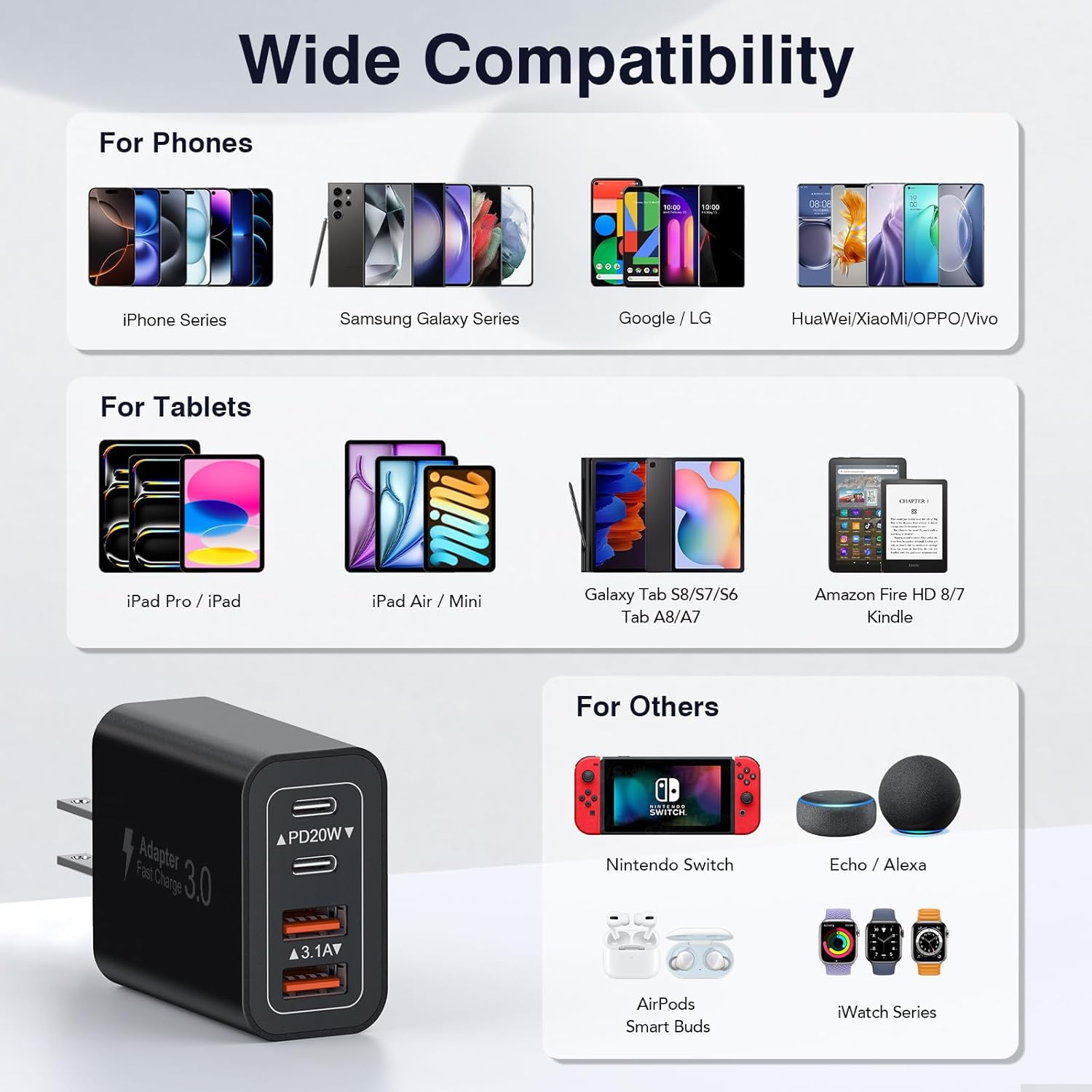 - Universal Compatibility:Due to the special 4-port,the USB charger is compatible with almost all electronic devices,charging adapter for iPhone 16/16 Pro/16 Pro Max/16 Plus/15/15 Pro /15 Pro Max/15 Plus/14/14 Pro/14 Pro Max/14 Plus/13/13 Mini/13 Pro Max/12/12 Pro Max/12 Pro Max/12 Mini/SE 2020/11/11 Pro/11 Pro Max/XR/XS/X/8/7,iPad Air/Pro/Mini,Samsung Galaxy S23/S22/S21/S20/S10/S9/S8/A12/A13/A22/A32/A52/A53/A71/Note 20 10,Tablets,LG,Motorola,Google Pixel and other digital devices compatible