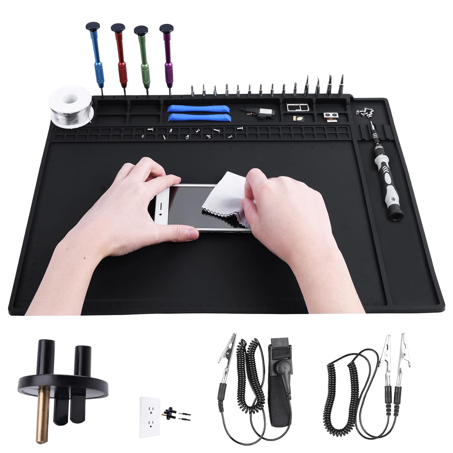 Anti Static Mat Includes ESD Wristband and Grounding Wire and Grounding Plug for Electronics Repair, Premium Heat Resistant ESD Safe Soldering Mat (17.7" x 13.6")