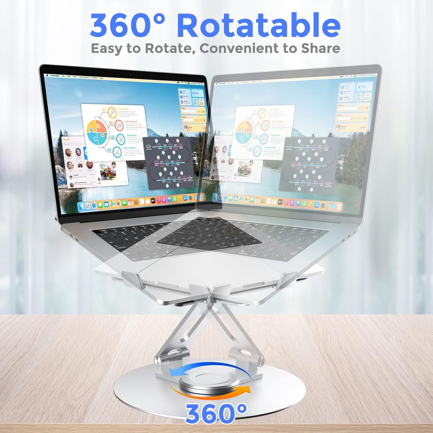 - 360° Rotatable: With a 360° rotatable turnable attached to the base, this laptop stand is supported by strong axis, allowing its top half to swivel flexibly to any angle,so it's perfect and convenient for you to share the laptop's screen to your partners especially for collaborative work at the meetings.