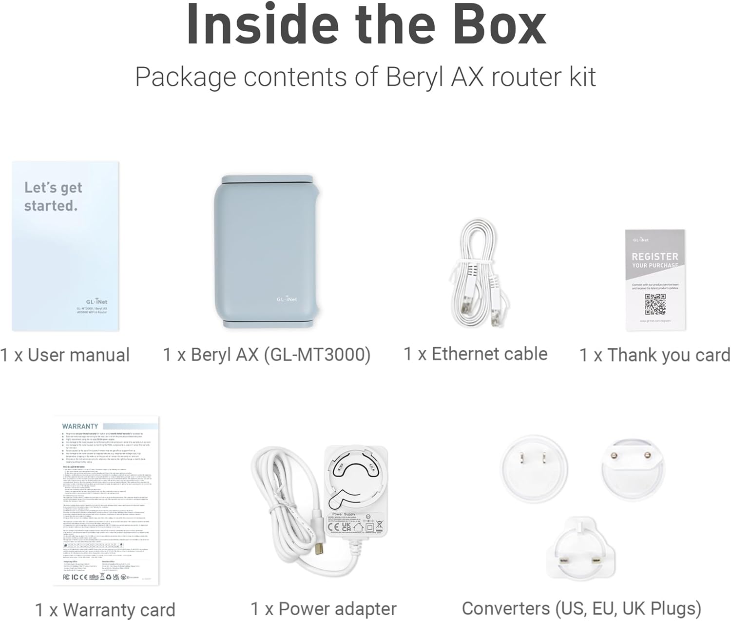 - Included Components : Ethernet Cable, GL-MT3000 (Beryl AX) router with 2-year warranty, Power Adapter (US Plug, UK Plug, EU Plug), User Manual Ethernet Cable, GL-MT3000 (Beryl AX) router with 2-year warranty, Power Adapter (US Plug, UK Plug, EU Plug), User Manual