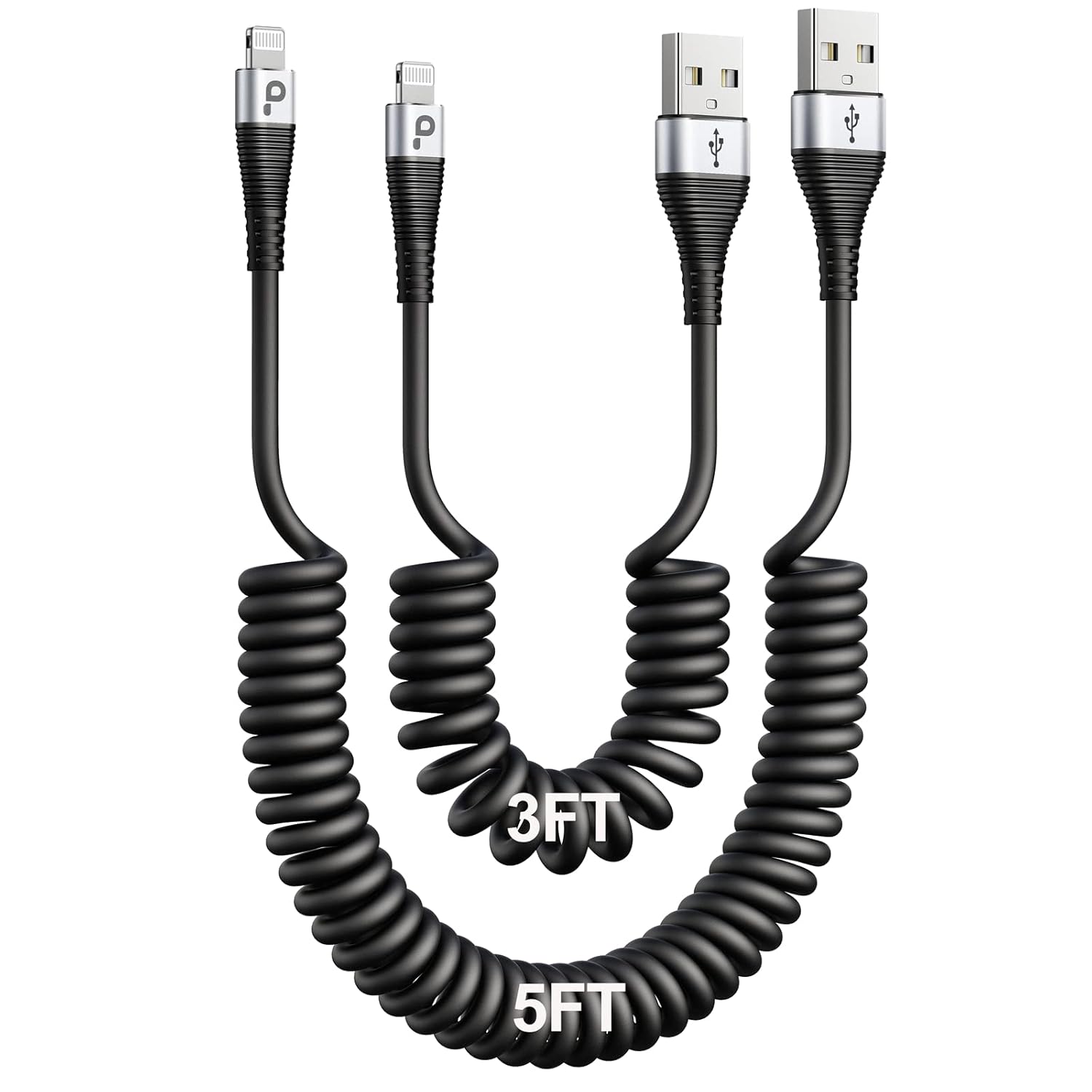 iPhone Charger Cable for Car (3FT/5FT), 2Pack Coiled Lightning Cable, [Apple MFi Certified] Retractable Charging Cord Compatible with iPhone 14/13/12/11 Pro Max/XS MAX/XR/XS/8/iPad/iPod/CarPlay
