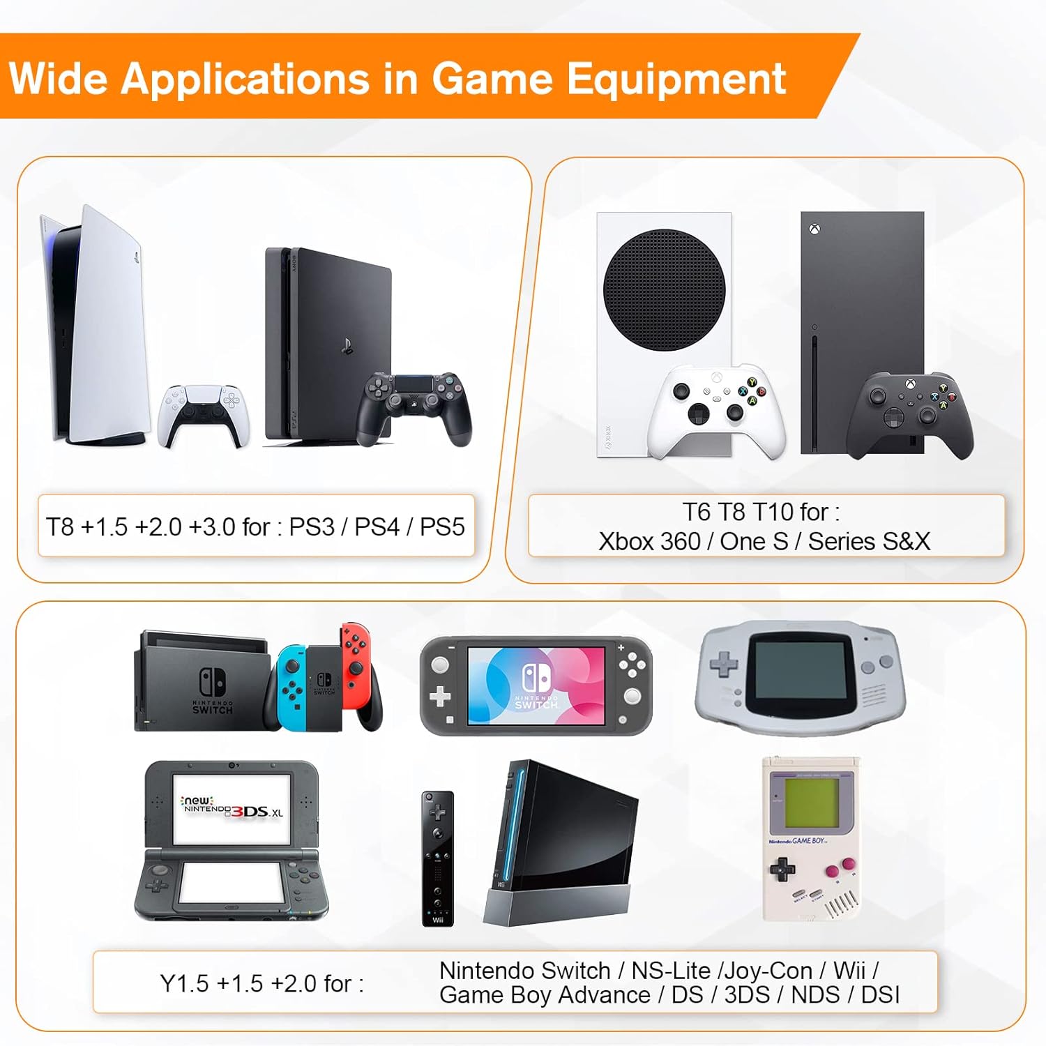 - 【Wide application】-- P2 Y0.6 +1.5 +2.0 are used for iPhone 7/8/X/XR/11/12/13, for their screens and batteries replacement only. T8 +1.5 +2.0 +3.0 are used for PS3/PS4/PS5. T6 T8 T10 are used for Xbox 360/Series S&X. Y1.5 +1.5 +2.0 are used for Switch/Joy-Con/Wii. T6 T15 are used for Ring Video Doorbell/Video Doorbell 2/Pro/Elite. T8 is suitable for Folding knife. T3 T5 T6 T8 +1.5 +2.0 P5 are used for Macbook Air and Pro. -1.0 -2.0 +1.5 +2.0 +3.0 are used for Computer/ Watch/Glasses.