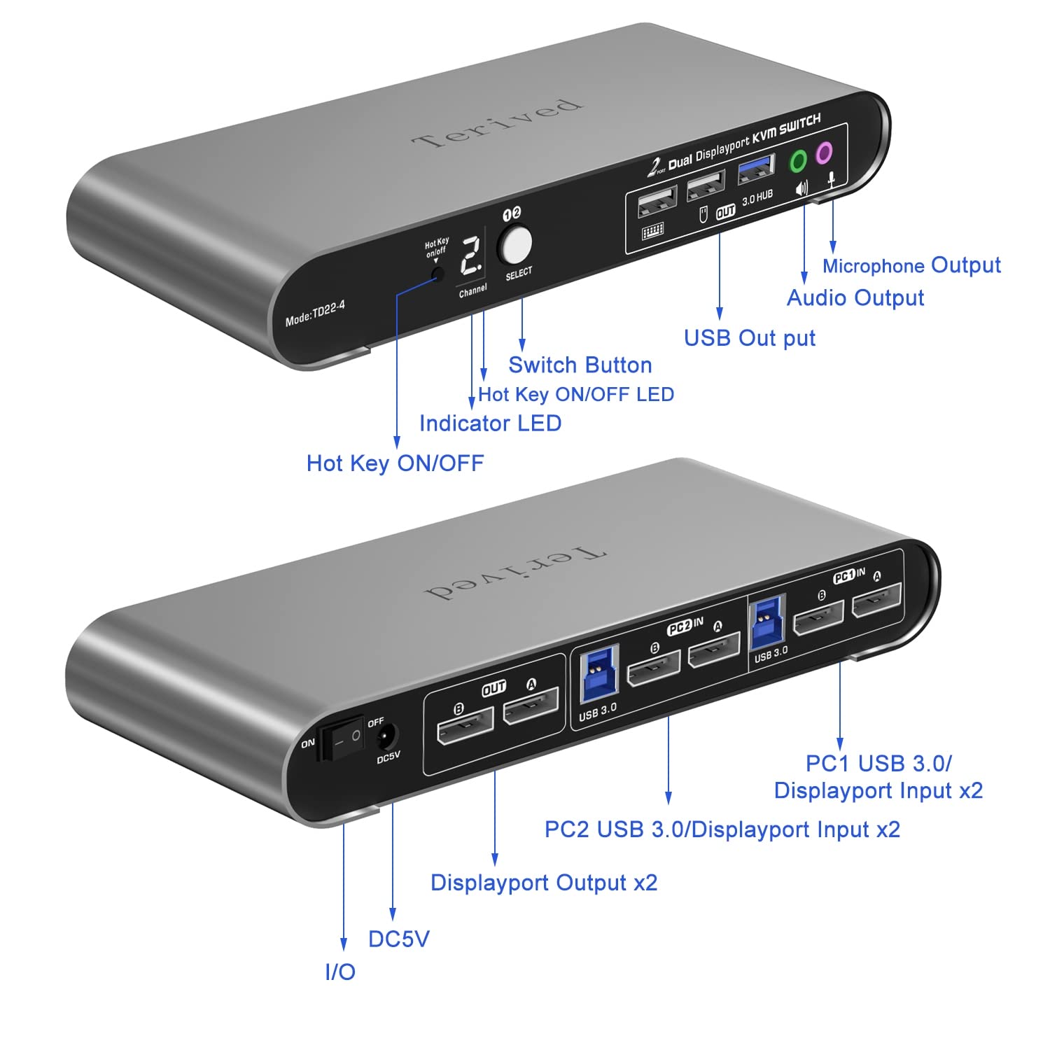 - Two computers two DP monitors KVM switcher- Controls 2 Displayport interfaced computers or other applicable devices using one keyboard, a mouse, one monitor with audio & microphone, and USB 3.0 HUB for data transferring rate up to 5Gbps/s (10 times faster than USB 2.0)