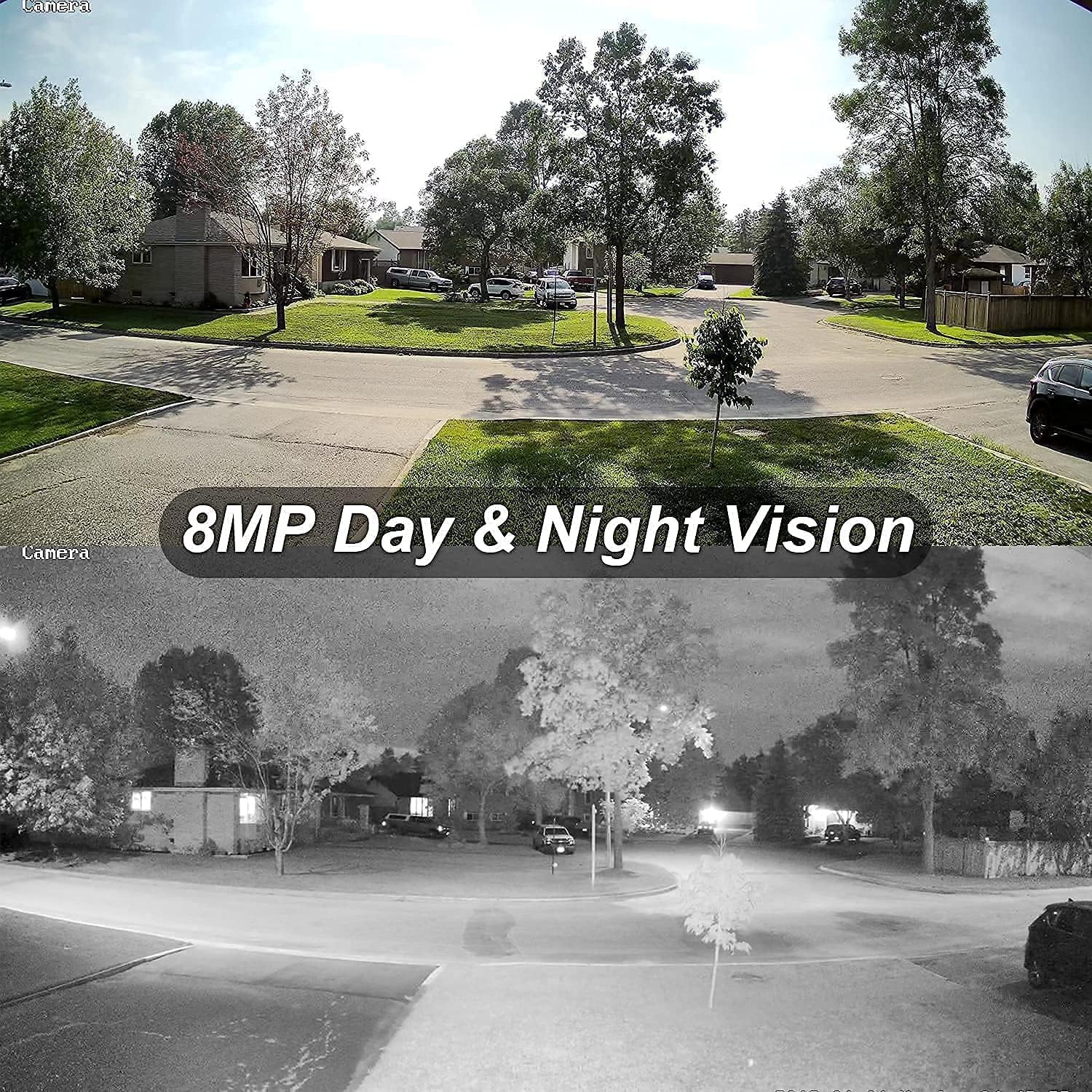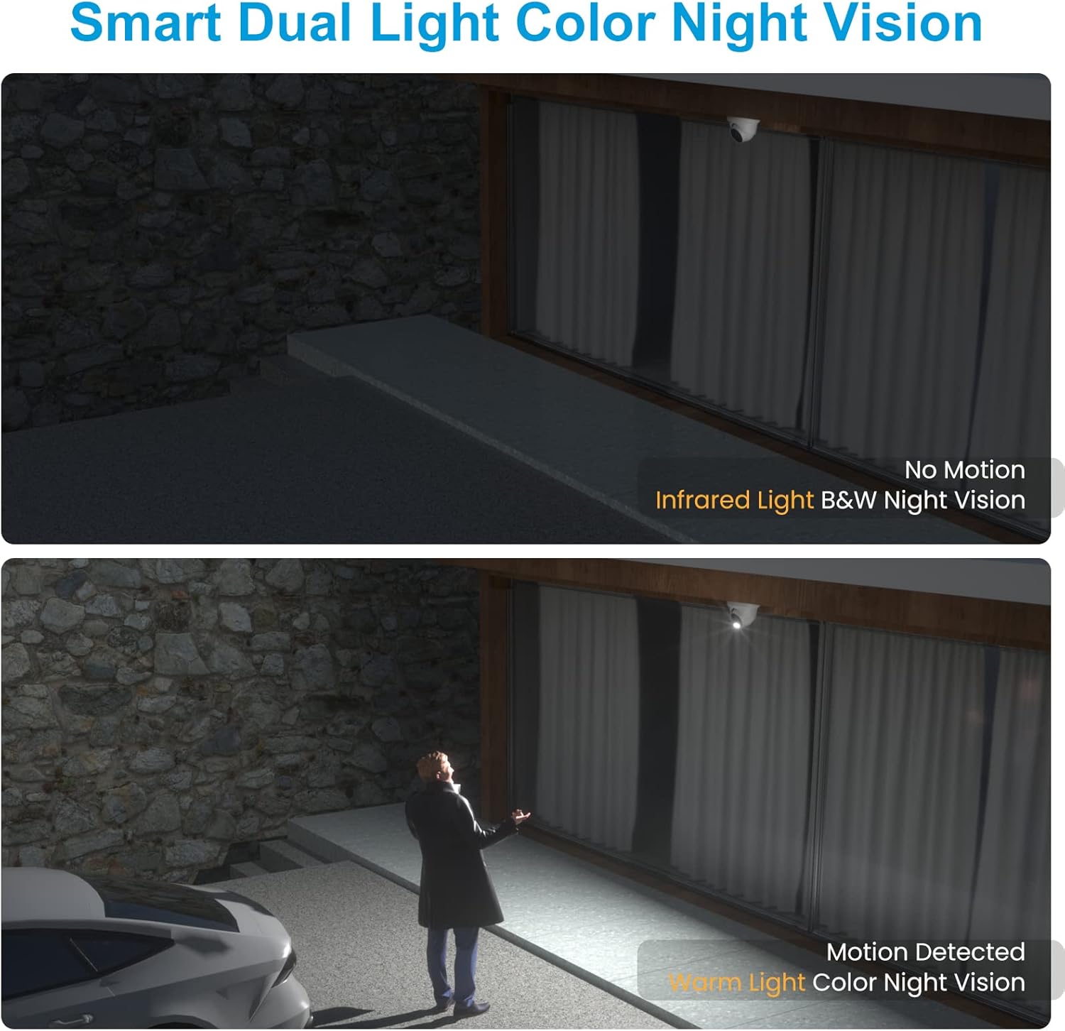 - Smart Dual Light Color Night Vision: This 4K security camera system has smart dual light color night vision function, when the camera detects people and vehicles, the LED lights will turn on and the video will become colorful, allowing you to see more details. No people/vehicle detected, the IR light run on to record a black and white video. Besides, you can setup the 24H color night vision, night vision up to 100 feet, and DWDR for clear imaging even in strong backlight, providing you with clear vision both day and night.