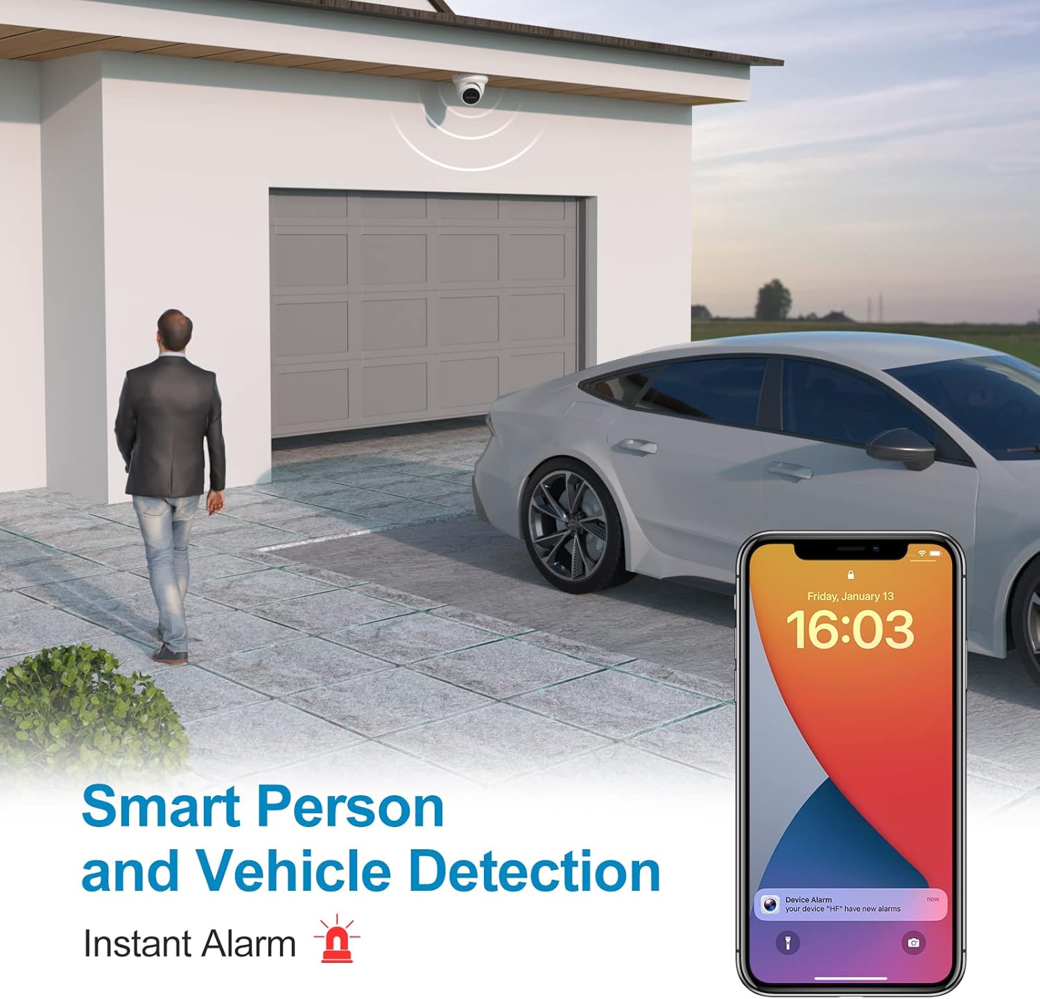 - Human and Vehicle Detection: This nvr security camera system can recognize human and vehicles based on shape, minimizing unnecessary alarms like animals or shadows. The ip camera can also be configured to specify the type of detection when it sends you an alert, so just glance at the lock screen to know what's going on. It also supports intelligent playback.