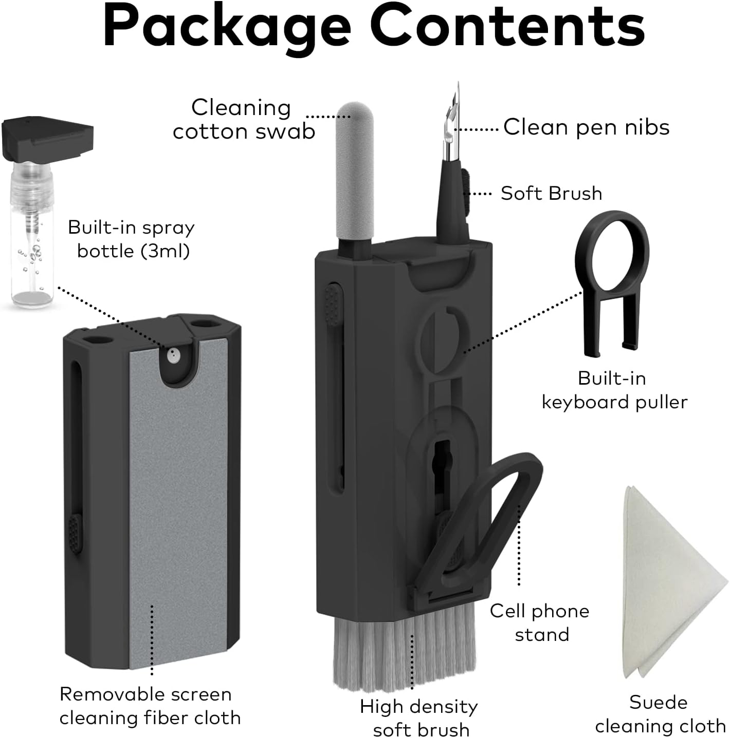 - MULTI-FUNCTIONAL CLEANING KIT: This 9-in-1 electronic cleaner kit includes 1 large high-density brush, 1 small soft sponge , 1 cleaning pen for airpods(includes metal tip, and mini high-density brush),1 Keycap Puller, 1 cell phone holder, 1 removable fiber cloth,1 flannel cleaning cloth and 1 spray bottle (3ml Cleaning liquid) for every cleaning need