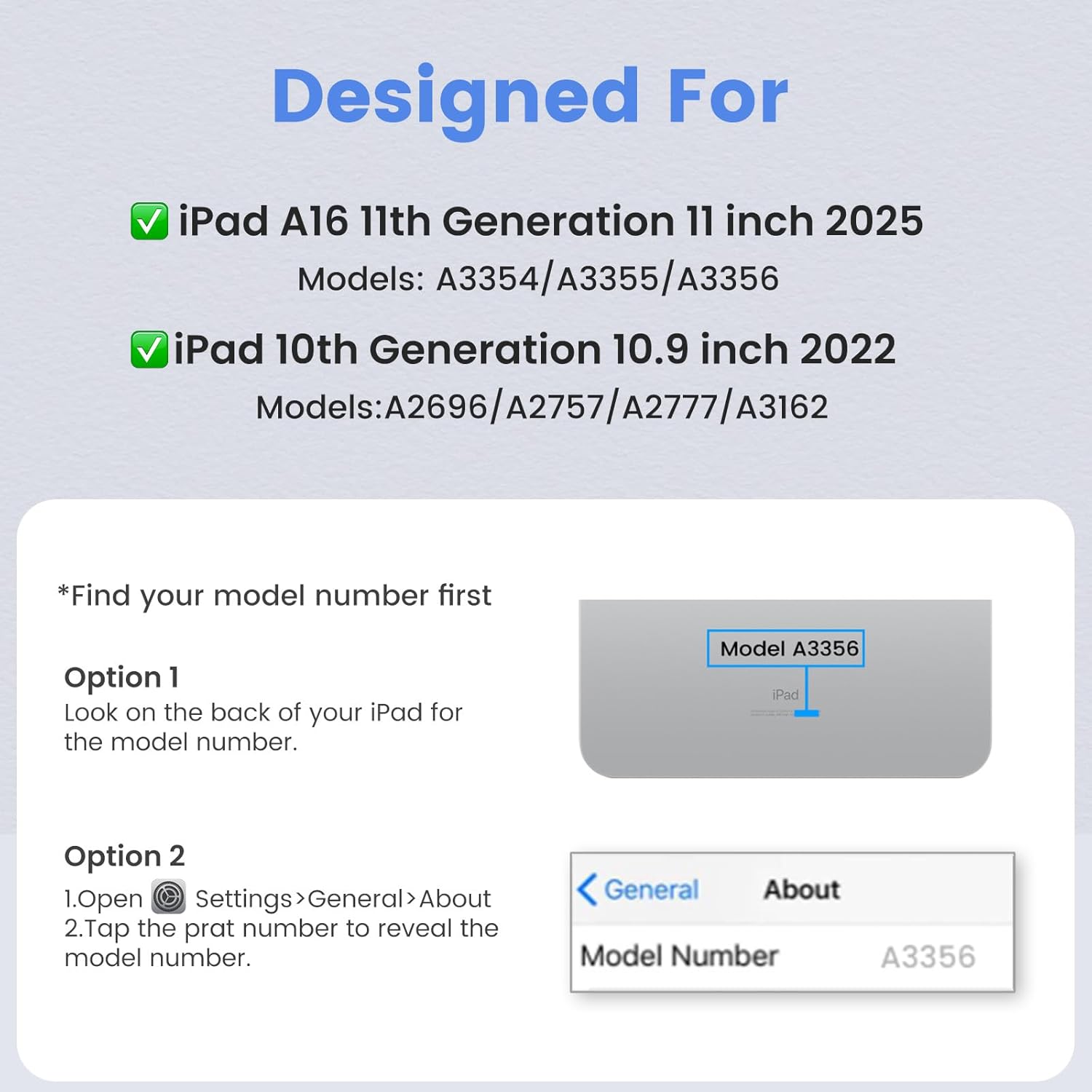 - ✅【2 in 1 Keyboard Case for 10.9"】❗❗No Pen included!❗❗The keyboard Cover is designed for iPad A16 11th Generation 11-inch 2025 (A3354/A3355/A3356) and for iPad 10.9 10th Gen 2022 (A2757/A2777/A2696).♐It's Not compatible with any other devices. Please check the model number back bottom of your iPad.