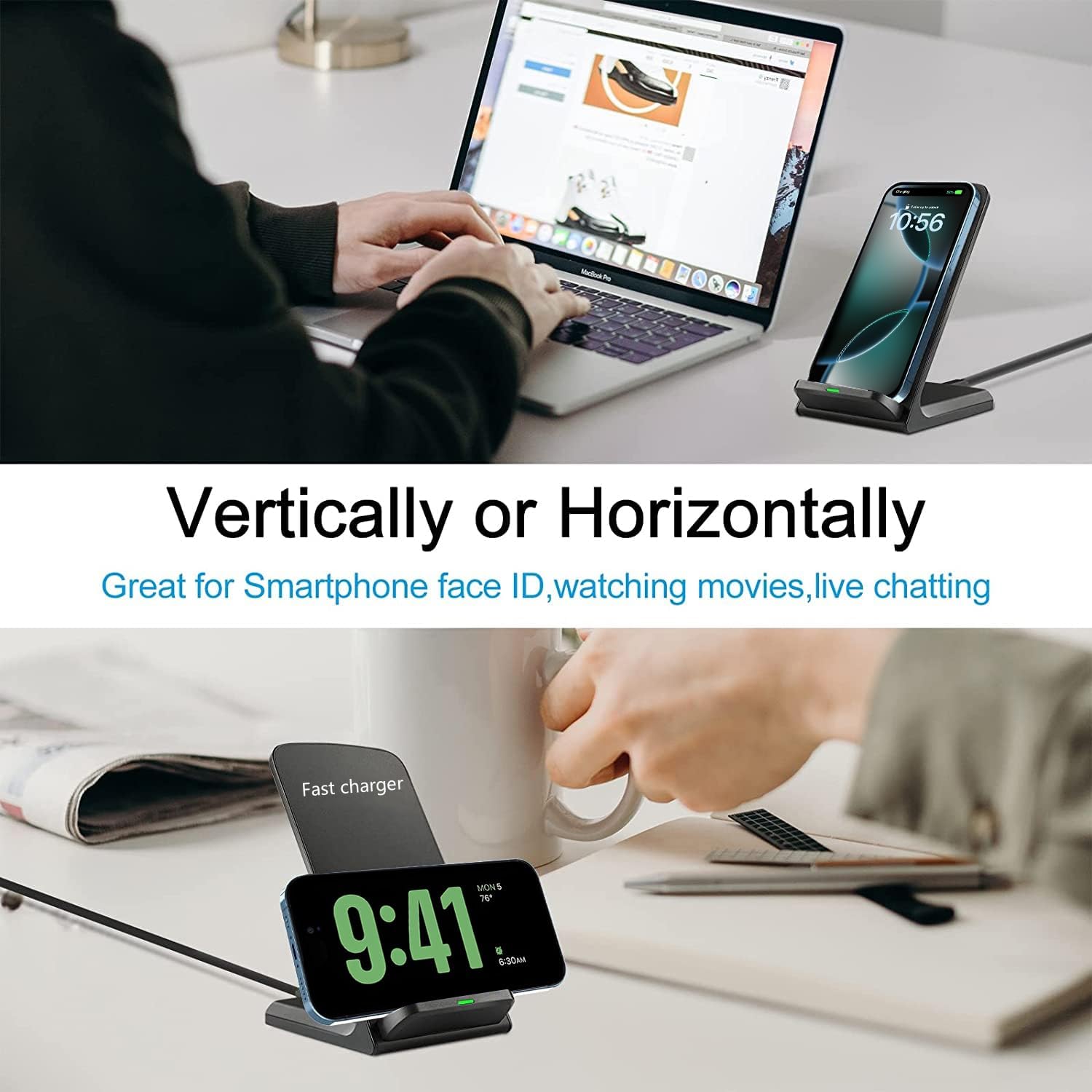 - Perfect Viewing Angles: 2-coil wireless pad charges your phone vertically or horizontally.Small size design for on-the-go easy storage,Work as a phone holder whatever charging or no, optimized for best viewing and iPhone’s Face ID, enjoy movies or play games while charging. Provides good stability for some curved phones and decreases the chance of dropping.