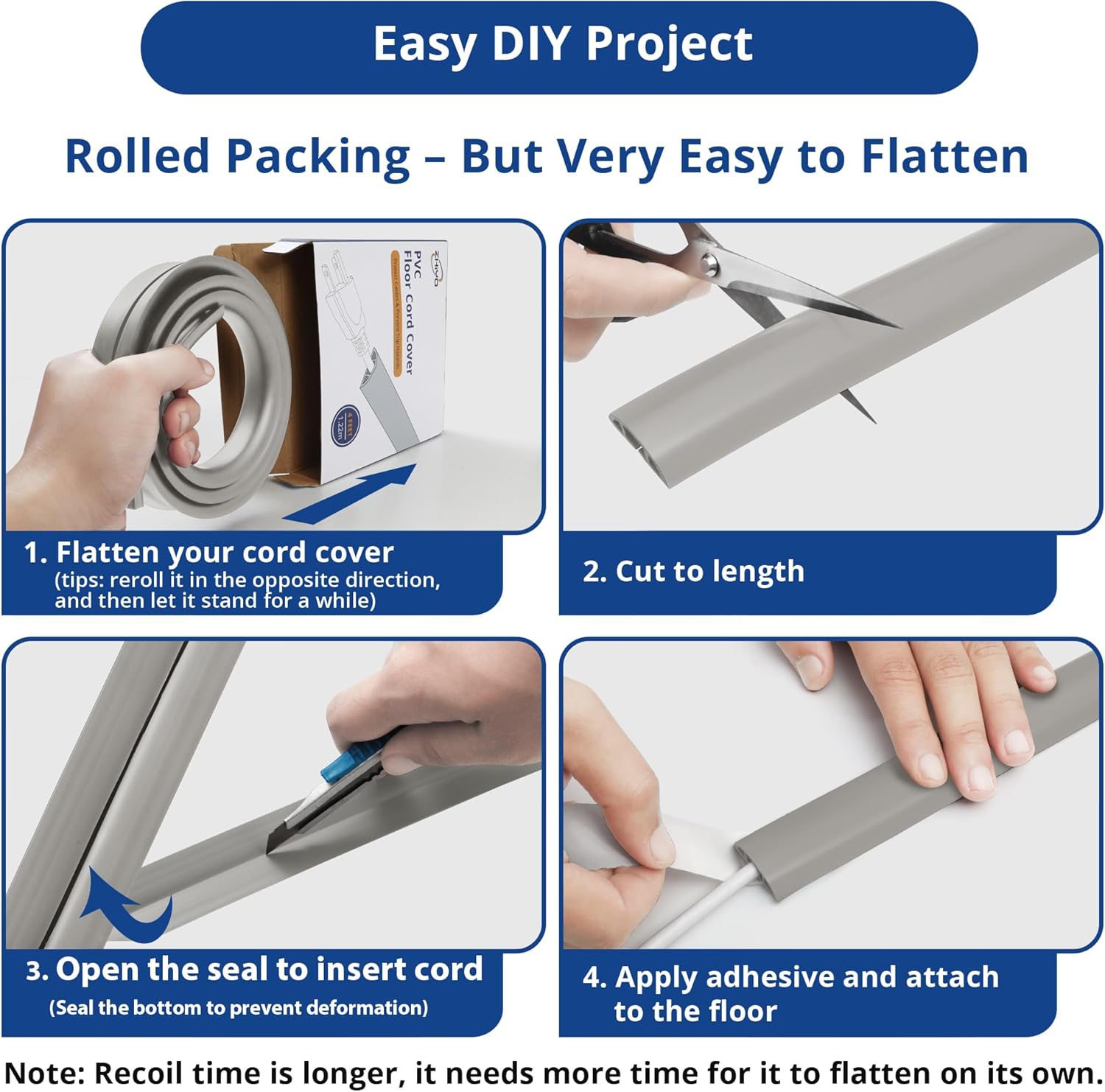 - Easy to USE - ZhiYo floor cord covers for wires kits include strong adhesive tapes that can help secure the cover to the floor. The half-split seal backing prevents deformation and can be easily opened with a utility knife. Simply cut to your desired length using scissors, ensuring a perfect fit for any home or workspace