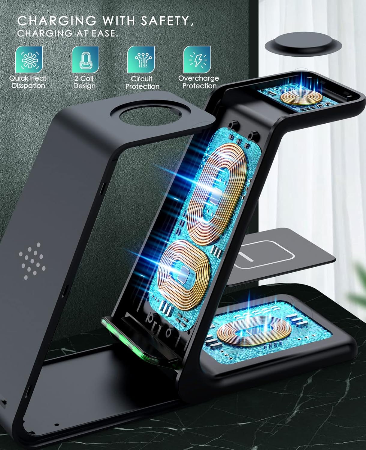 - 🛡️【𝗦𝗮𝗳𝗲 𝗖𝗵𝗮𝗿𝗴𝗶𝗻𝗴 𝗦𝘁𝗮𝘁𝗶𝗼𝗻】The wireless charging dock provides you a safe charging experience. Employing over-current protection, over-voltage protection, and over-charging protection, this fast charger ensures your charging safety. With massive heat dissipation holes on its back, charging becomes even cooler and safer. Coated with a layer of skin-like silicone, it’s 100% anti-static and can endure accidental collision or scratches