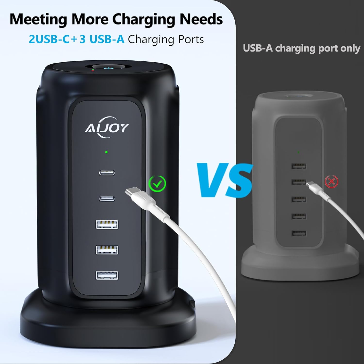 AiJoy Flat Plug Power Strip Tower with 9 Outlets and 5 USB Ports (2 USB-C), 1200J Surge Protection, 1625W Extension Cord with Multiple Outlets Charging Station for Home Dorm Office Supplies