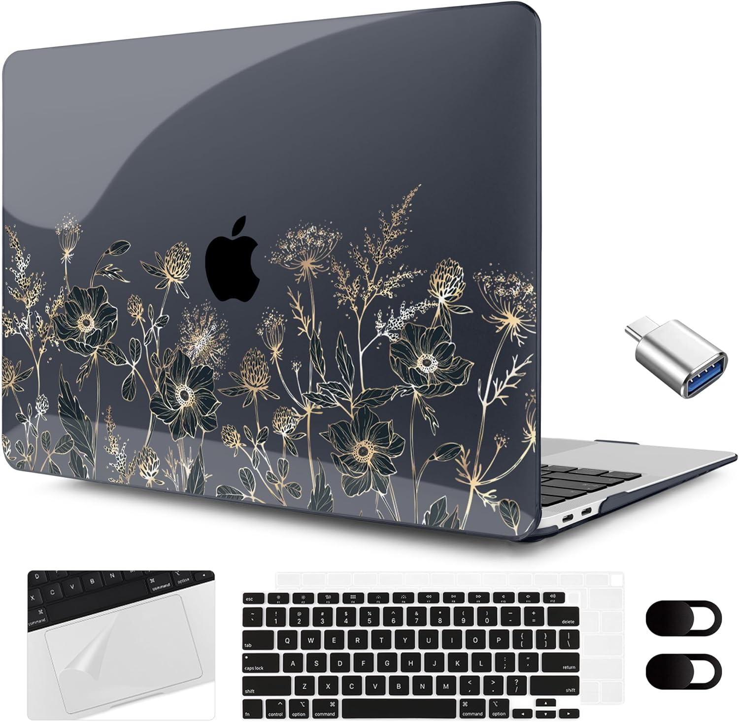 MEEgoodo for MacBook Air 13.3 inch Case 2021 2020 2019 2018 A2337 M1 A2179 A1932, Case for MacBook Air M1, Hard Shell with Keyboard Webcam Cover & Trackpad Film & Type C Adapter,Golden Flowers & Herbs
