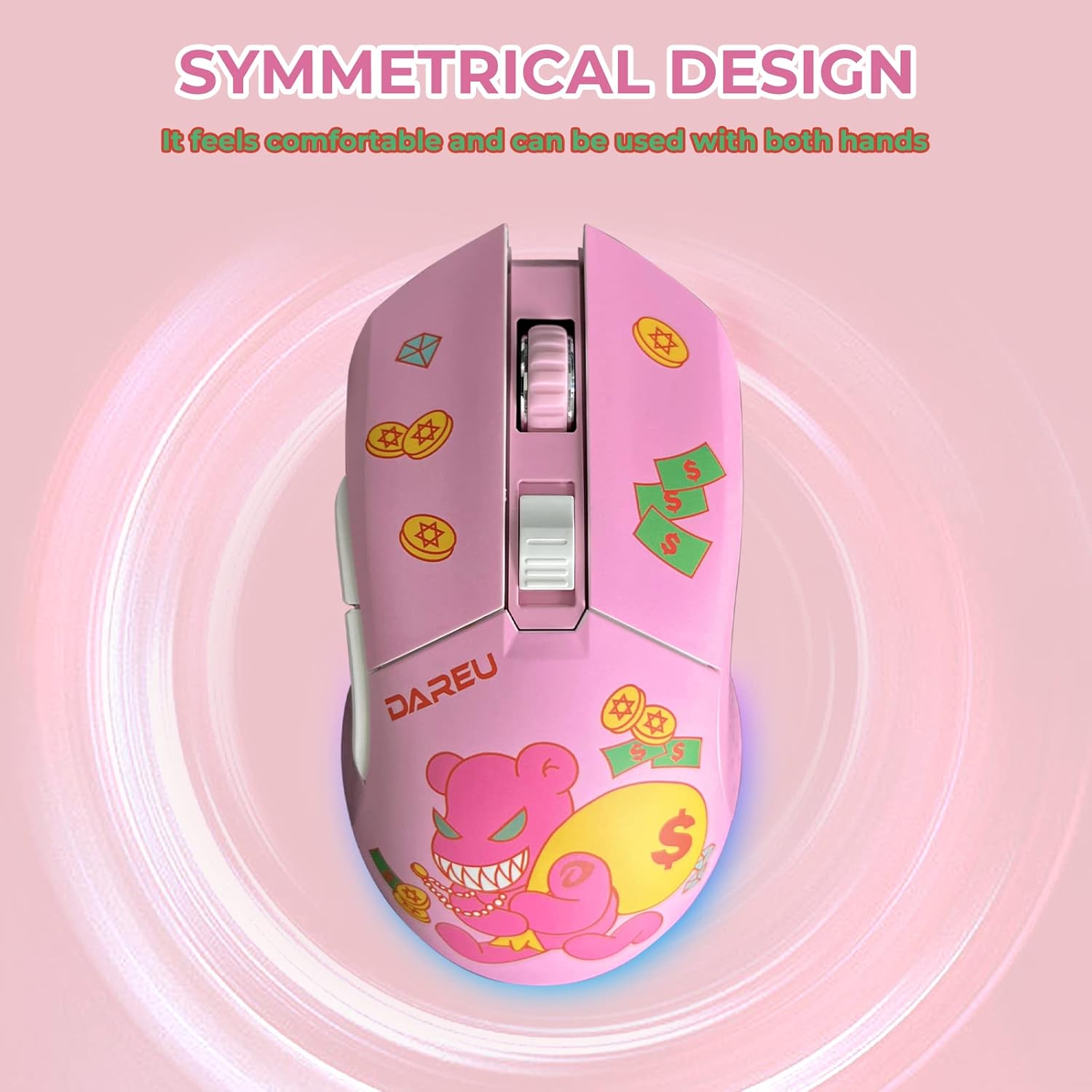 DAREU Pink Wireless Wired Gaming Mouse, Dual-Mode Rechargeable 7 Programmable Buttons,10K DPI,RGB and 7 Adjustable DPI Levels up to [150IPS] [1000Hz] for PC Notebook Mac(Lucky Bear)